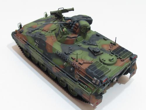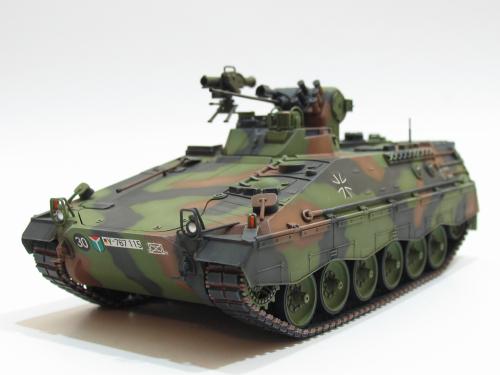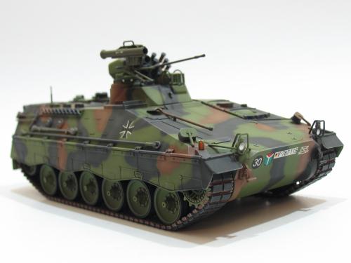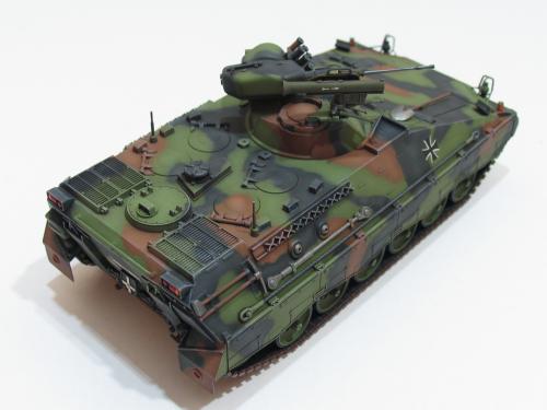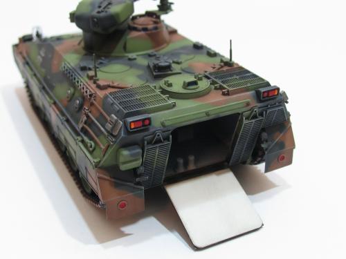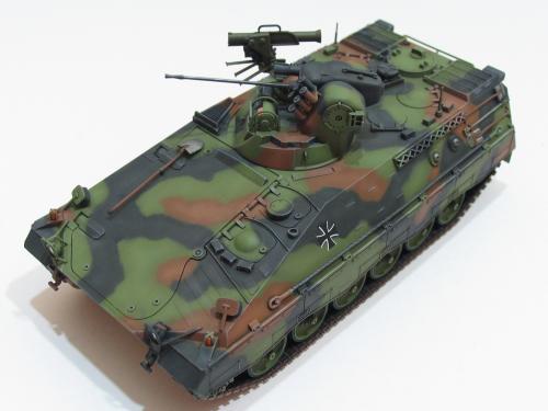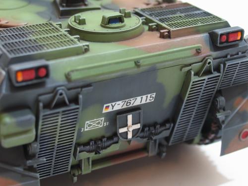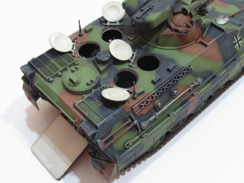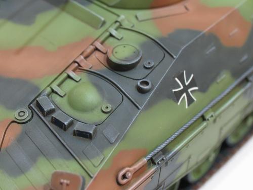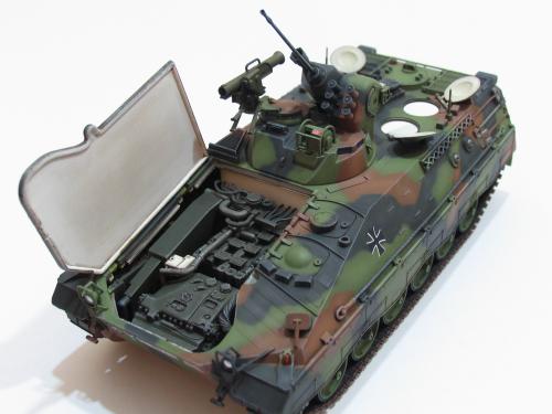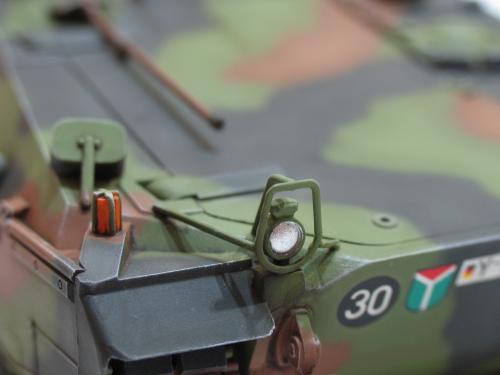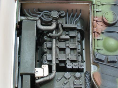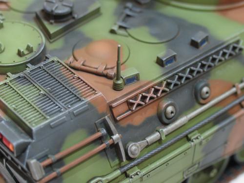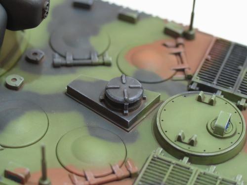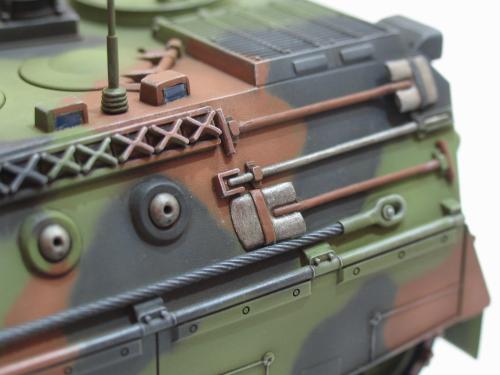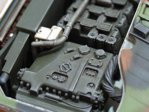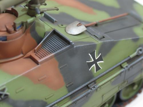 这次使用的是田宫的版子,70年代的产品,够烂的. 细节不怎么样,组合度也不是很好.制作过程中有少许改造,比如钻了机炮炮口,给车窗加了透明件等. 这次使用了新的黑鹰U2喷笔做北约3色迷彩,直接喷感觉还好,在喷之前我先用铅笔规划出了迷彩色块,然后喷,这样比较容易操作. 该套件带有简单的引擎内构,我先将这部分完成,然后遮盖起来,再给车体上色. 炮塔上的两个勾子套件里没带,所以就用龙的3号版件里多余的勾子YY了两个...