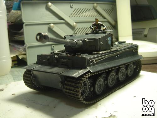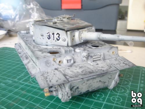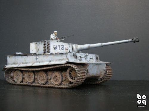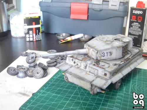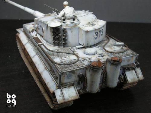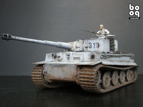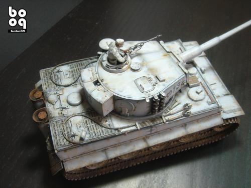 爱德美板件,编号是TA961,不同于现在的编号,不知道是不是绝版了。我是2005年购入的,当时也不太懂板件,甚至不知道爱德美这个品牌,只是在店里老板的热情推荐下,就连同几罐模型漆买下了。当时我才刚刚开始学着为我的模型上色,(其实从88年起,就开始玩模型了,一直在素组)。做一件虎式坦克却是我多年的梦想,已经无法抑制心中的激动。搬回家就开工了,因为水平有限,直做,手涂德灰,未做旧化,3天后完成了。三年来他就一直静静地躺在我的展示柜里,默默地无声无息。看了土居雅博的模型制作视频,他的一句话启发了我。“不仅仅是把模型组装起来,而是要让他来述说一段故事。”于是我开始重新为我的虎式涂装。 先是把零件一个个拆下,好在胶水涂得不多,不过轮子还是着实让我费了不少力气,有的还被弄断了轴。原来的水贴号码是蓝色的,用马克笔直接涂成黑色。 以前看过一些关于盐分掉漆的贴子,就试着玩儿了一把,撒盐水,喷消光白,水洗。结果做得过了头,没办法就又喷了一遍消光白。这下却有了漆面脱落后,反复修补的效果。为了营造气氛还在正面,用烧红的螺丝刀戳了几个弹痕。 自认为还不错,就开始做旧化。用打火机油和油画色,做渗线和流锈。干的水粉笔蘸油画色在表面蘸出较浅的锈渍和污渍。 干扫喷完抢金属的履带后,用自家院子里的土,混上褐色,土黄,赭石等水粉色,用水调开上在轮子,履带和车底上。用粉彩刻画排气管,炮管和弹痕熏黑的效果。 最后,在履带,机枪等处干扫上鉻银色,完成雪虎的最后组装。 兵人是板件自带的,原来是黑色的制服,参考田宫的封绘涂成白色。 制作中尝试了多种以前没用过的技法,有的是自己琢磨的,在尝试中体验了做模型的快感,真是过瘾。