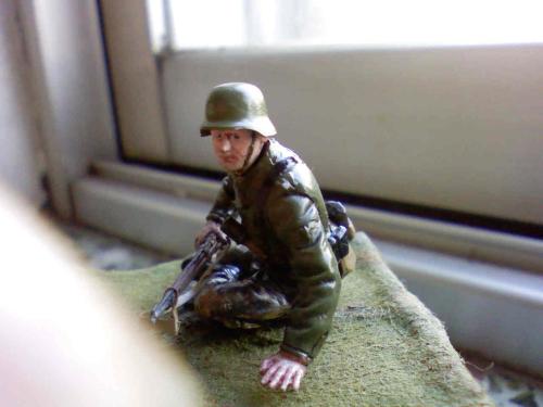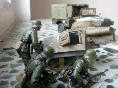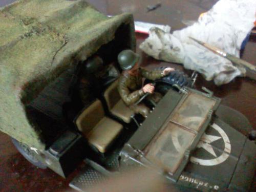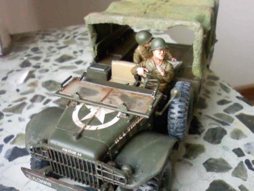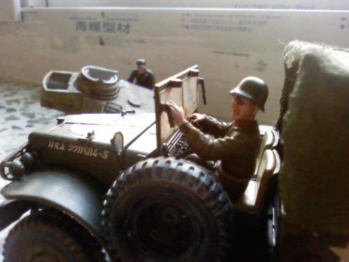 德国伏击人员使用龙的一代兵套件,美军驾驶员为意大利威利斯驾驶员加龙的手臂与头盔改的,搭乘人员是威龙美军空降兵反坦克套件里的,不存在盗版问题。场景工程较大,单以兵人参赛~美军兵人及卡车全部丙烯手涂,德军为丙烯+仙盈水性漆手涂,枪带是华泰粘胶的外皮裁的,整体成本较低,未作较大改动
