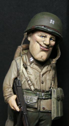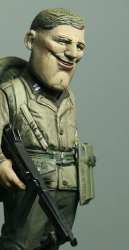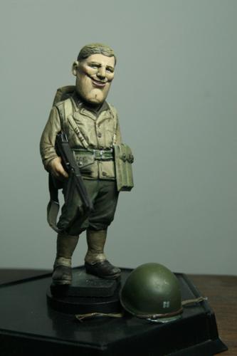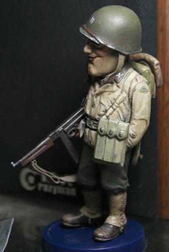 盔带和枪带均使用橡胶带完成,扣环用铜线改造,难点是美军汤姆森冲锋枪的背带非常穿法特殊而复杂,盔带改造到位可以真正的扣上 考证是诺曼底登陆的美游骑兵部队,头盔是上尉军衔,左臂手绘游骑兵臂章,裤子涂装是1944年诺曼底登陆游骑兵部队普遍的绿色式样,没有使用封绘29步兵师的褐色
