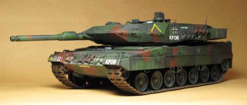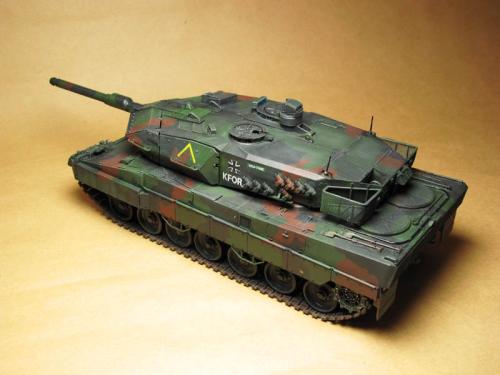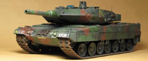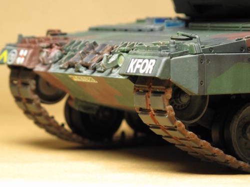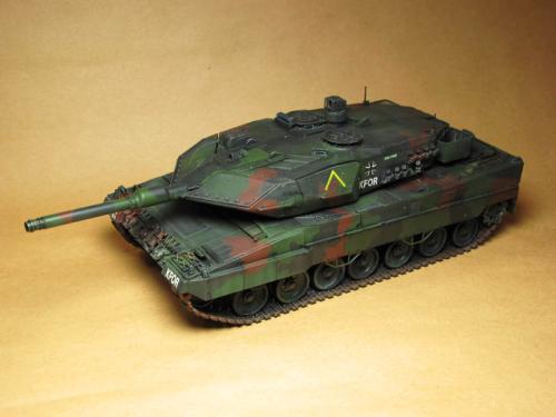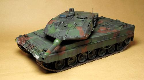 田宫的豹2A5,直做 直接用XF67\68\69遮盖喷涂迷彩 首先滤镜2遍,然后黑色渗线 突出部位用白色油画颜料干扫 车轮用粉彩笔磨碎+ZIPPO油涂抹 履带内侧与车轮接触部分喷涂XF11