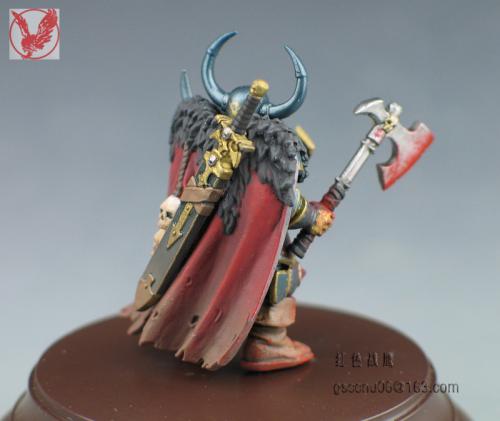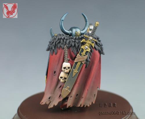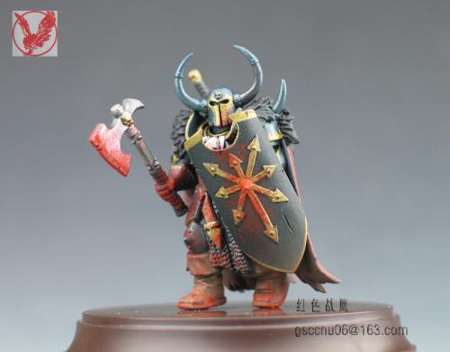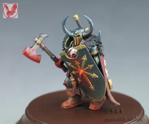 这个小兵是从玩混沌朋友手上抢来做着玩的,练练涂装技巧,有很多自己DIY的部分,纯属瞎搞。当时边做边意淫,基本思路就是自己调配邪恶的金属蓝,细细涂上各陆金色花边,朋友说基本快涂成神选了。。。另外就是意淫模拟战斗状态,先用盾牌尖刺撞击,再用膝盖顶对手腹部,最后一斧斜劈下去从颈部到腰部,鲜血渐满混沌战士一身^_^。。。 不会用ACDsee,用PS调整了一下图片大小,照片未处理 自暴下缺点:血迹颜色太红比价失真,皮毛的表现还要加强点