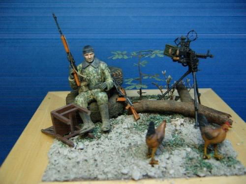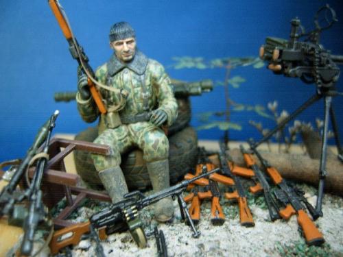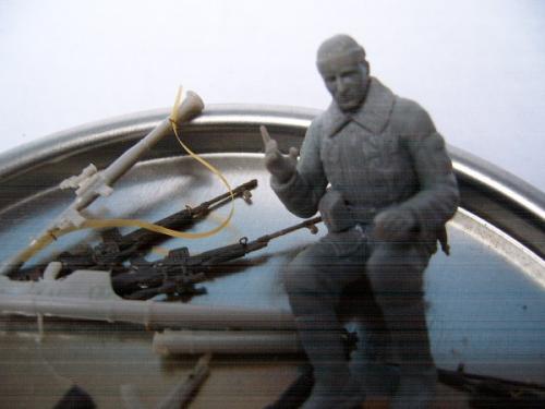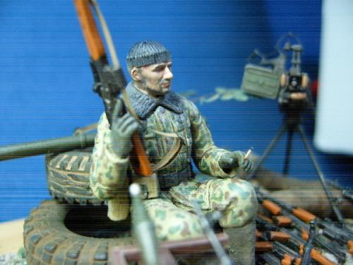 主体用了龙的3008,脑袋用了美军狙击手的,由于板件太肉,将大部分的衣服折皱重新刻线,那块翻毛领用钢锯条拉毛,原件实在不怎么样,武器都是平时四处收罗的。