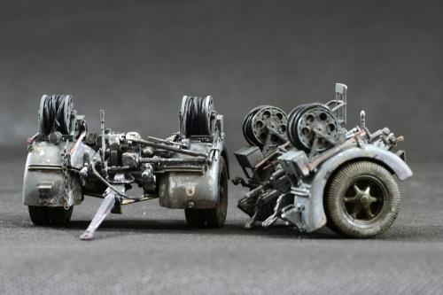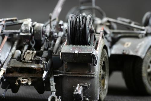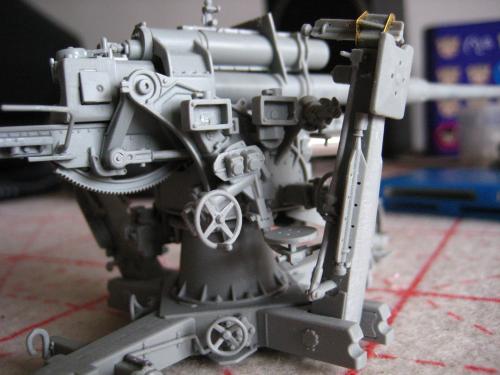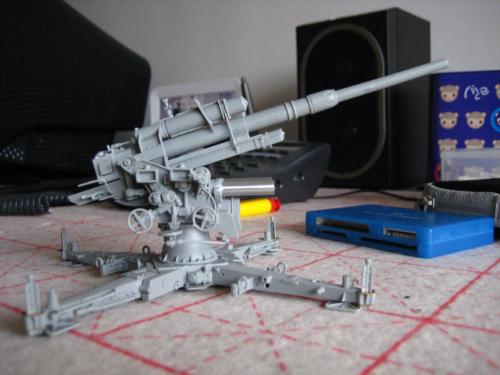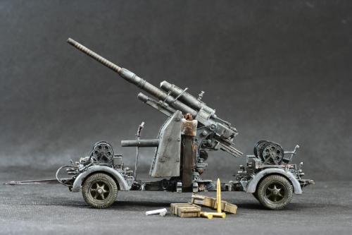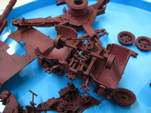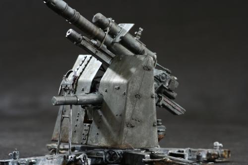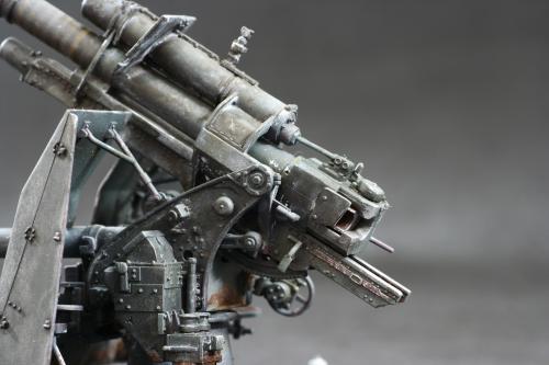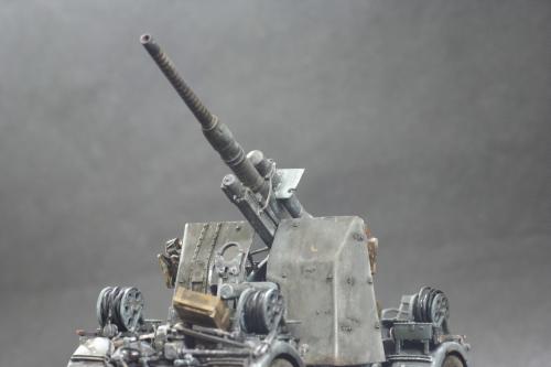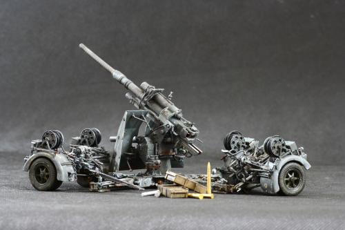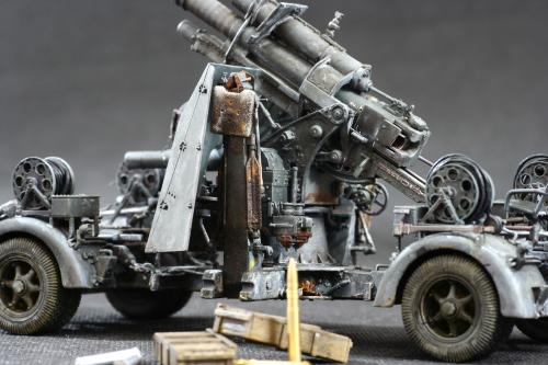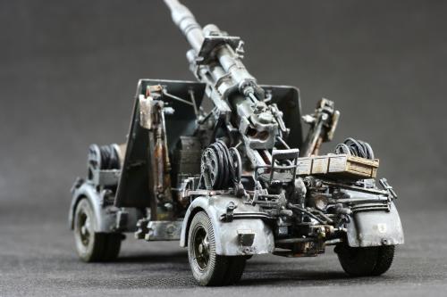 龙的6287(3 in 1),我做的是flak37 过程: 1、组好后,本身件是灰色的,于是掺了红色在500号补土里,全部喷补土 2、先喷郡士的29号防锈漆,然后再喷德国灰(郡士40号德国灰 6%+郡士30号消光白 30%+郡士65号亮蓝 10%) 3、贴水贴,待干,刮出掉漆效果,郡士28号黑铁色全车炮做阴影,包括水贴,做出风化效果 4、部分容易积锈的地方涂上wave的生锈水,待干,油画颜料做流锈 5、水粉洗浅色,油画洗深色,扫银 6、喷消光 7、再用wave生锈水做出新锈效果 8、再用油画洗一遍,结束