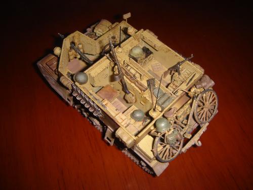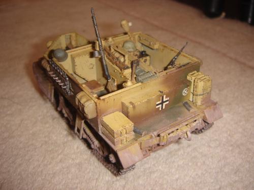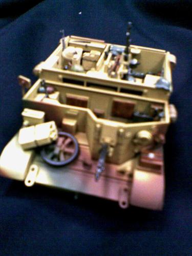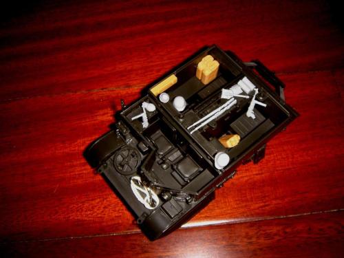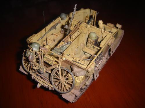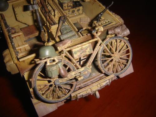 使用的是田宫的板件和其水性油漆上色,在参考历史照片的同时,自己加以修改,其中由于家里房子小,所以不方便制作,都是下班在公司完成的,所以部分素组照片用手机拍摄,图象模糊请见谅,难点是如何修改以及添加何种部品,考虑到战时的特殊背景,和补给情况,在作为指挥和侦察功用的同时,适当添加了车乘人远的随身物品,油料,水箱,弹药,反坦克武器,已经德军使用的自行车(田宫板件),作为点缀,虽然是小品,但是个人最喜欢的一个,小中见大,等待去发现