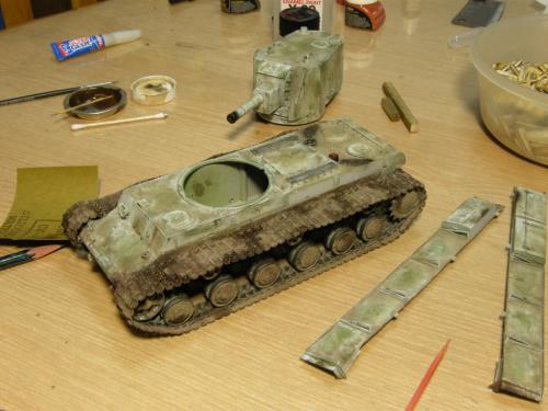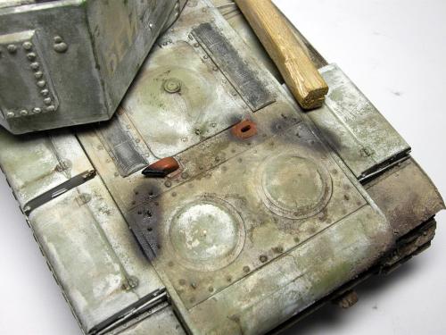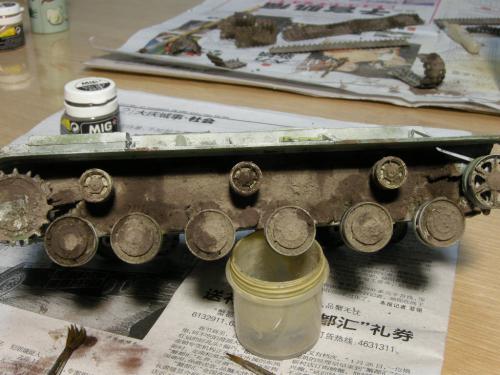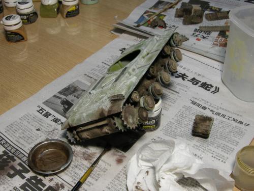 这件作品是源于大一时候的一个烂尾,在寒假里,为了消灭堆积。才罩上了一层雪地迷彩。 整个作品是直做无改,但由于烂尾时间稍长,丢失了一些小部件,作品的完整性有些遗憾。本想再加些防水布来遮羞,但实在是来不及了。 三年前,作品是按照最基础的方法制作的(当时算是刚开始玩)。预置阴影、喷郡士的苏军绿1、炮塔稍微做了下滤镜、略微处理了一下履带。 这次的烂尾翻新也可以说是一次雪地技法的实验,像是雪地还有发胶都是第一次用。在上雪地迷彩之前,做了以下处理:1、模仿CM,用另一种绿色略微处理了一下舱门舱盖。2、用德国灰重新喷涂履带。 本次雪地迷彩使用的主题技法是发胶掉漆,由于没有买到发胶,以啫喱水作为代替,效果并不是那么理想。之后又用硬毛笔添加了些磨擦剐蹭的效果。这就是第一张的效果图。但这时我们对比雪地迷彩的照片,回想石膏的涂抹。我们会发现目前的效果是剥落、摩擦感足够,而雨水的冲刷感不足。所以在之后我用补充了其他雪地常用技法,包括溶剂的擦拭,毛笔沾溶剂戳,还有白色的重新补涂。以上的流程结束后就是第二便的效果。之后在一些高手的建议下,我用重新在战车的上部还有人员活动较为频繁的地方再做处理。但本应使效果再上一层楼的处理,却成了悲剧的开始。由于油漆浓度处理的不得当,海绵雕漆弄得很难看。但事已至此,也不好再改了。 之后的渍洗很平常,就是仿照mig的自然渍洗液的颜色调了渍洗液。 之后是掉漆,是本次制作最为失败的步骤,掉漆没点多少,但还是一团糟。 那么下面就是泥污的制作,泥污其实很简单了。就是按照adam wilder的做法。这里我想提醒大家的是,一定要记住plaster for volume。泥土的量是来源于石膏而不是mig土,泥土的色彩可是是mig土也可以是水性漆,油画色。但要明白的是,泥土干了会变浅,一定留好富裕的颜色来源(用于处理变化)。之后处理些变化做一些飞溅。这个步骤的遗憾是,土的厚度变化不够明显,也没添加草针。 再之后就是尘土处理,还是无法处理好颗粒感,很是遗憾。 最后就是处理履带和轮子的磨损感。 到此本次的制作就基本完成了。要是有时间补上两块防水布就好了。但总得还是效果还是令自己满意的,相比之前还是有进步的。