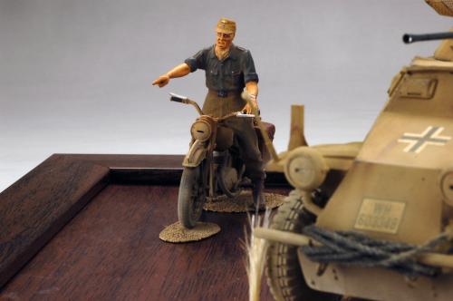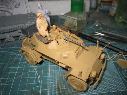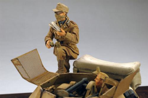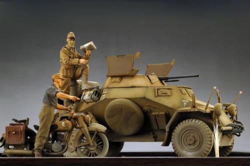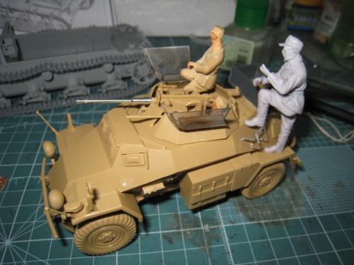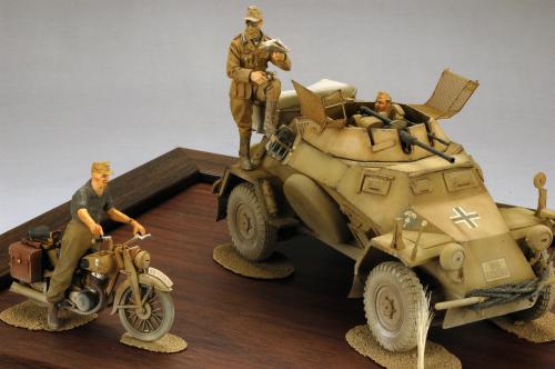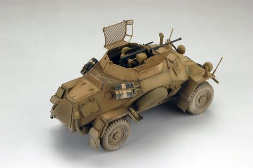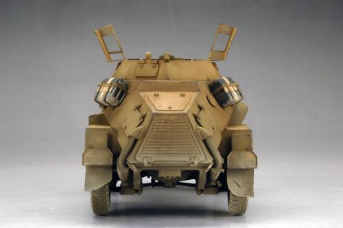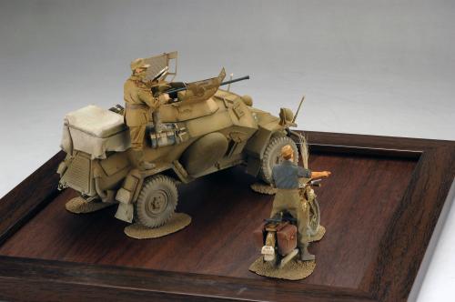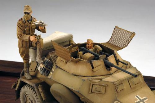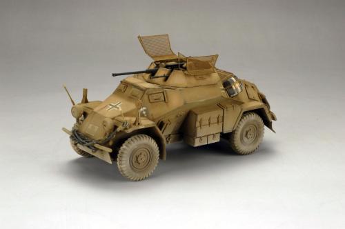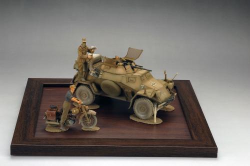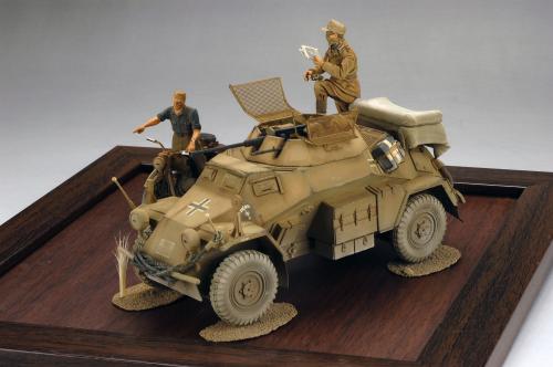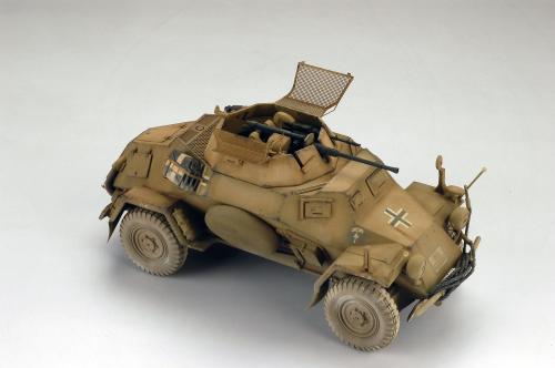 套件是田宫35286,早就入手的东西和威俊比已显落后,单套件给出的兵人还是不错的,这盒222是田99年作品,组合度一如既往的好,只是小零件上不太突出罢了,本车笔者只是换了附加油箱架,别的几乎直做,挡泥板薄板用薄纸片制作,加了灯线(不怎么看得出来)整车制作好后觉得尾部特土于是加了一个小箱子,整体看着好了很多。田宫的给出的水贴说明很讨厌德军十字正好在附加油箱下面,给制作带来小小麻烦。兵人用了一个别的非洲军人形使得在车里的兵人目视方向更自然些。上色用的田水旧化方面山寨滤镜法白色居多,主要表现出退色感觉,最后用粉彩修饰下底盘。本来想做个场景搭配的,这段时间一直很忙实在来不及了,意思一下,各位上眼了。