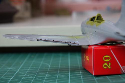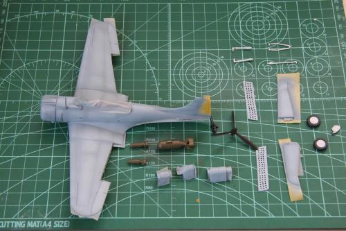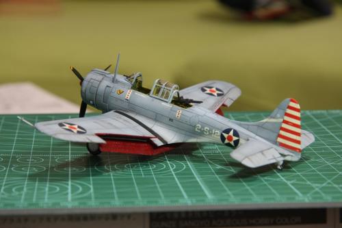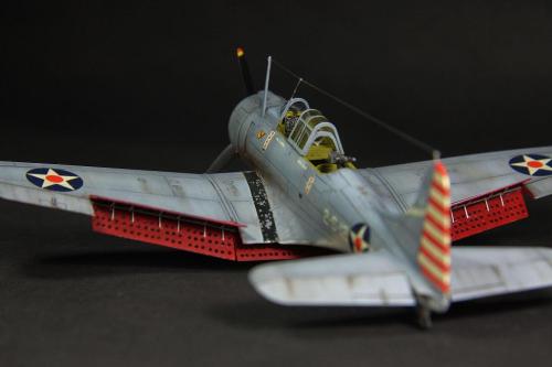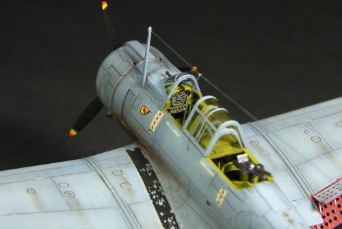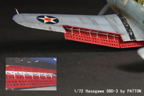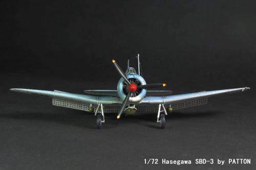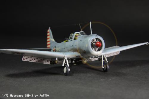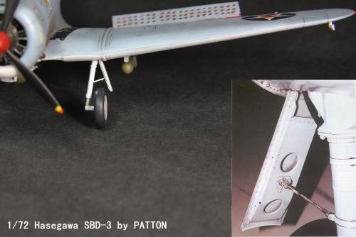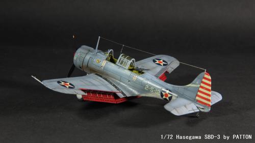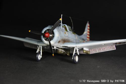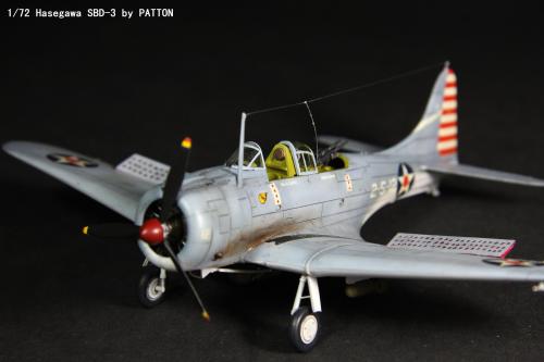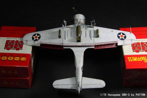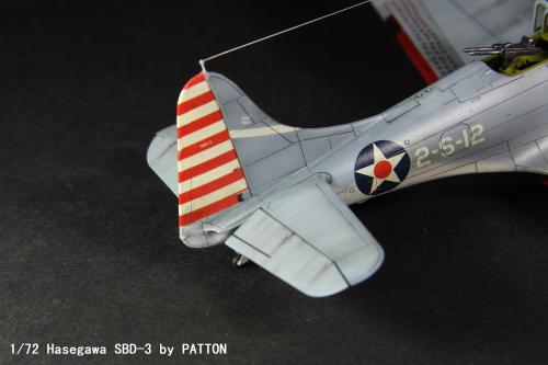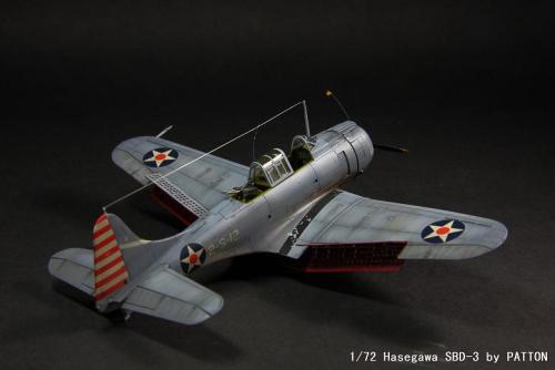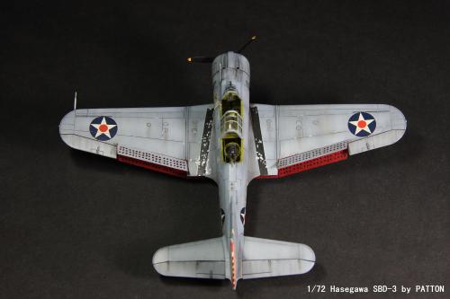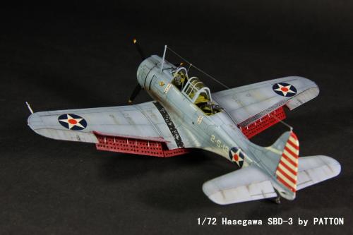 长谷川 1/72 SBD-3 (1942年珊瑚海海战期间美军VS-2俯冲轰炸机中队12号机涂装) 郡士油性漆喷涂,颜色自调,田宫珐琅漆渗线、渍洗,粉彩修饰. 改造部分: 1、切除多孔襟翼,用0.5mm胶板自制,钻孔,做成打开状; 2、切割平尾可动翼面,做成下垂状; 3、用流道拉丝添加襟翼联动杆、主起落架支撑杆; 4、切开透明座舱盖,做成打开状.