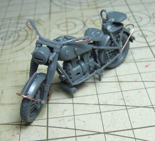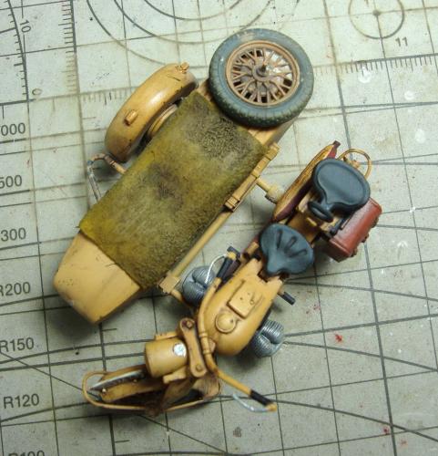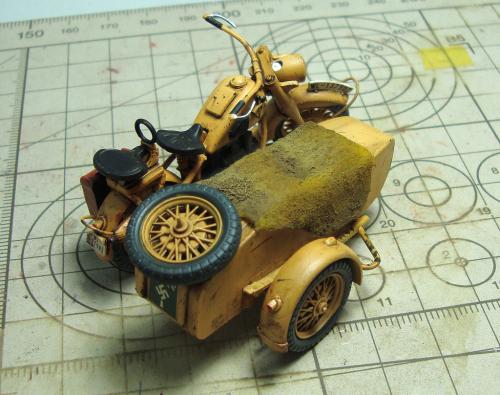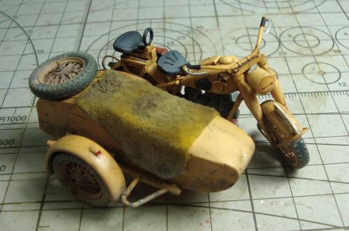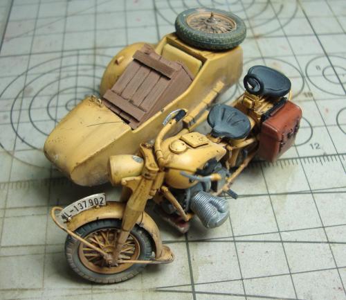 使用田宫的套件,72年的模具,相当的肉以及悲剧。用铜丝以及铜管自制了部分细节。 油箱上的BMW的标志还是涂出来效果好一些,因为笔不好,效果不是太好,如果有水贴就很赞了! 摩托的分色比较麻烦,特别是轮子的胎黑,如果能转动就比较好操作。 边上坐斗里面的细节惨不忍睹,用湿巾做了个篷好象也不是很好,或者放个弹药箱盖一下。这块(帆布?羊皮?毛毯?),你觉得象什么就是什么! 滤镜、渍洗、消光后上了MIG土做尘土。收工~!