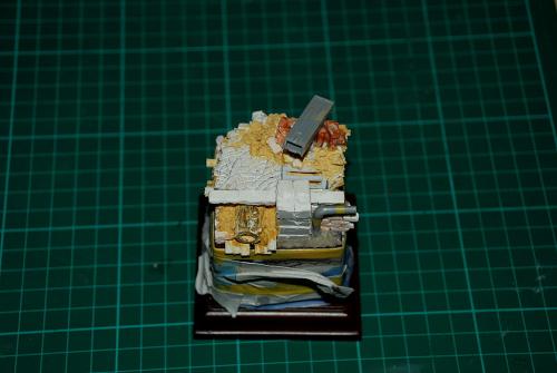 选取了龙6019里的一个苏军.略做了改造,全身棉衣\裤子刻线加深,增加了头盔带\枪带\包带,用石膏\ABS\笔管模仿城市下水道制作了地台.