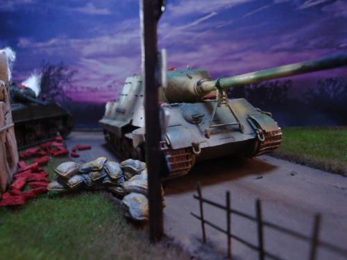 车辆:威龙7250、7305套件,房屋KT板、地台、草皮、乳胶。 套件直做,唯一的改造将挡泥板部分切除。 难点是:徒手喷硬边迷彩,海绵掉漆,用KT板做房屋。 心得:战车旧化逼真,用KT雕刻房屋,喷漆旧化,有质感。