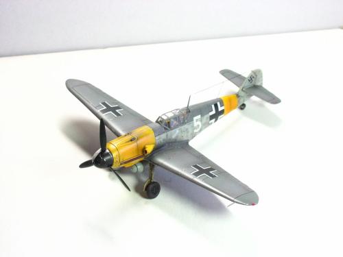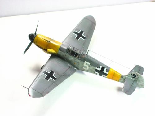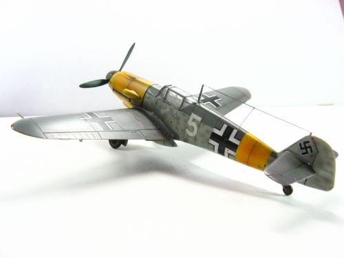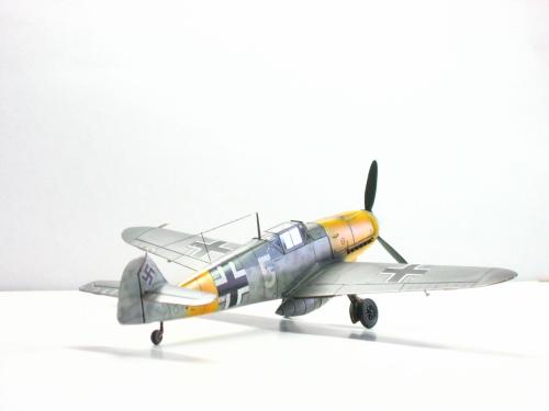FineMolds的1:72 BF109F-4.板件是非常不错的,带有简单的发动机内构,但是要做成展示的话,要改的地方实在太多了,所以做的时候直接就合上盖板.涂装参考了AEROMASTER的方案,采用了1942年JG52联队的巴克霍恩座机,白色5号和巴的个人标记的水帖是从堆积中找出的.模型里面带的那套迷彩水帖实在是没有用武之地....做的时候也没有仔细考证,做完才发现翼尖下面应该没有黄色的:(