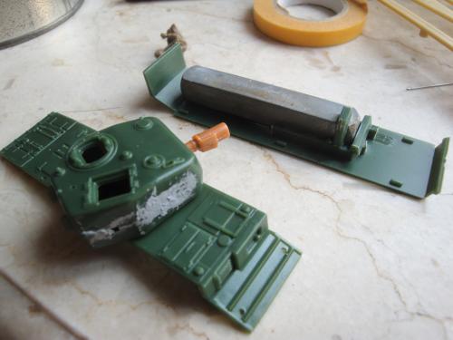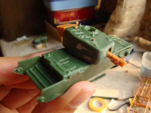 改造方面工作不多,主要是用铜皮假了个潜望镜,用铜丝做了起吊环,用铜丝替换了天线,机枪钻孔,但根本看不到。 另外很多的功夫花在了上下炮塔的无缝,还有那个比较恶心的炮管。另外这个环球虽然是其装甲类的精品,但桥梁钢管上还是有狠多的缩水,用田宫灰补土补了很久,现在看效果还可以。
