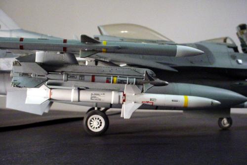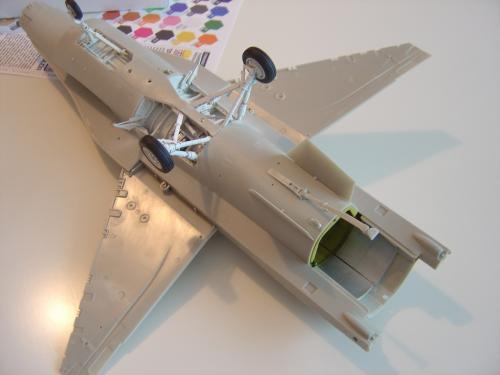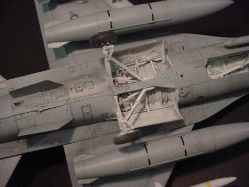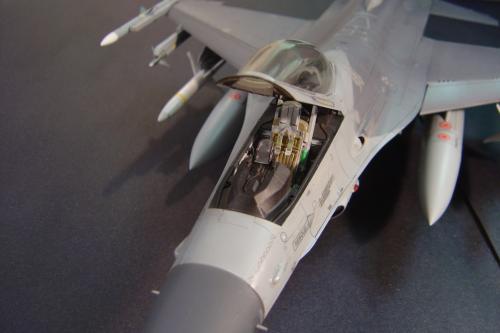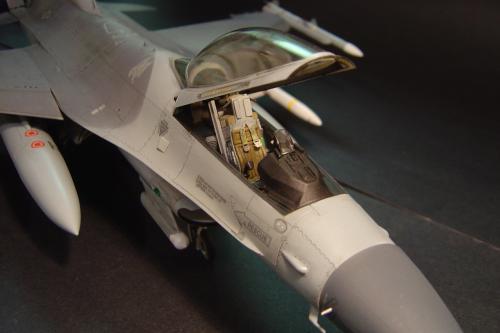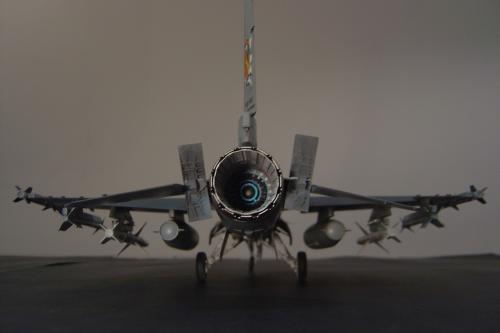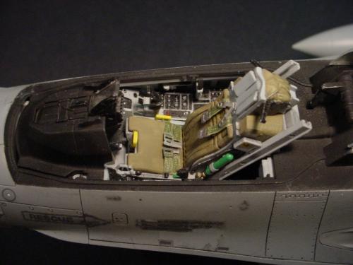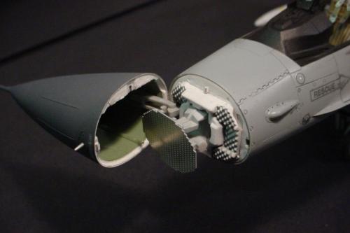 1:32的没有作出气势来很可惜。坐舱内部虽然采用了蚀刻片,不过依然缺乏质感,特别是座垫和安全带,弹射手柄上的黑黄警告色也没有画;主起落架上还留有合模线,发动机作的比较单调;主色上面迷彩的分界有点硬;摄影的技术还可以更提高一点 |