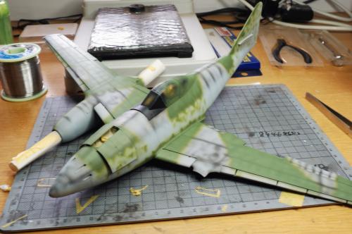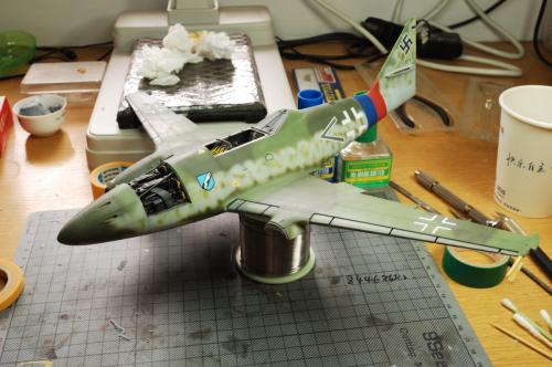 铁十字标志,战术编号和帝国防空识别带遮盖喷涂,万字标志和JG 7标志采用水贴。田宫珐琅漆渍洗,极细面相笔点掉漆。轮胎部分用mig土干扫。最后全机喷君士182号消光漆保护。