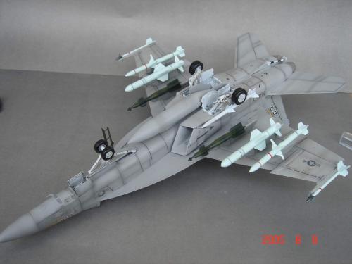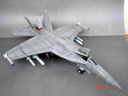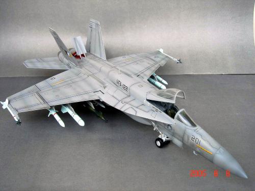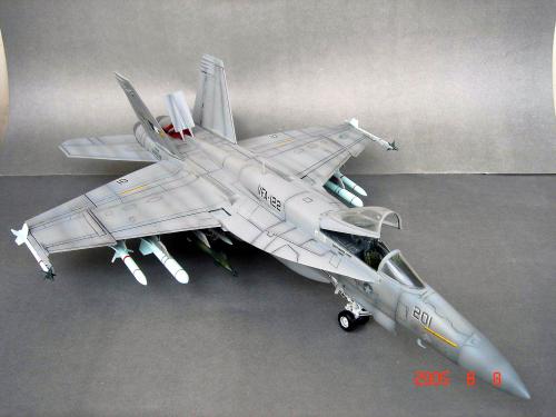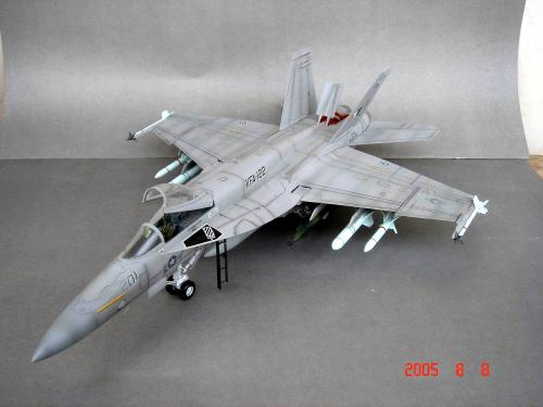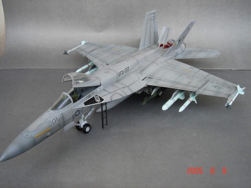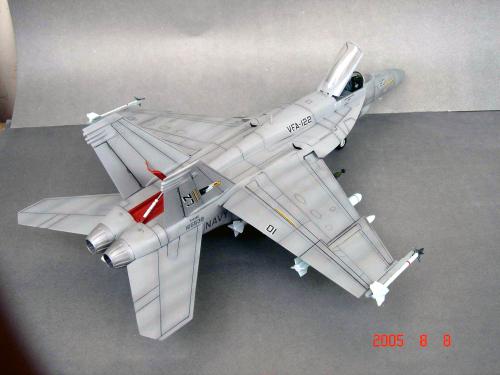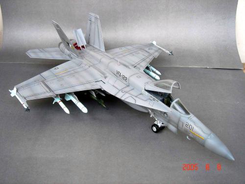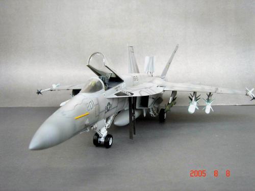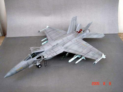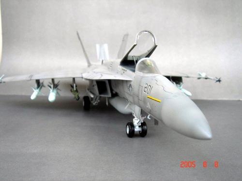 模型要目:意大利1/48F/A-18E套材,此模型是北方的一个模友来武汉公出时送给我的.(在此感谢一下) 套材本身还是不错的.美中不足的是刻线很粗,组合度不是很好.一贯的伊达雷利的毛病. 为此我特地买了牛魔王的PE为其丰富细节. 制作小结:由于我很少用PE.没有什么经验.导致在粘接PE时.乐泰胶水使用过多.将很多PE的细网状 结 构破坏.惭愧!看来还要多练! 声 明:由于本人没有数码相机.不能随做随拍.又怕赶不上交作业,所以没有没有上色前的照片. 敬请各位评委的原谅!