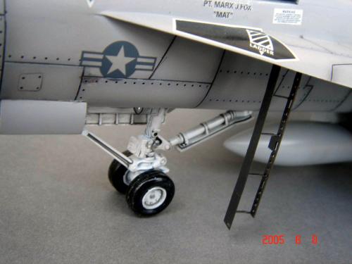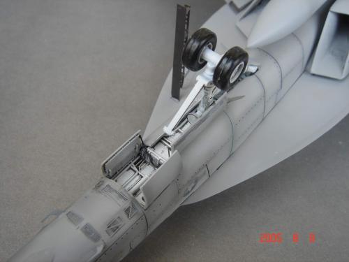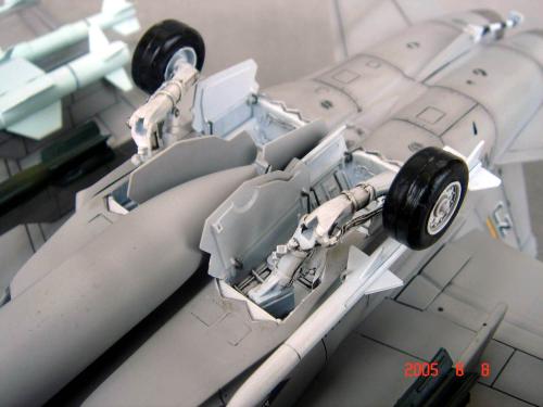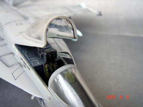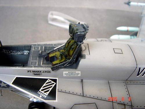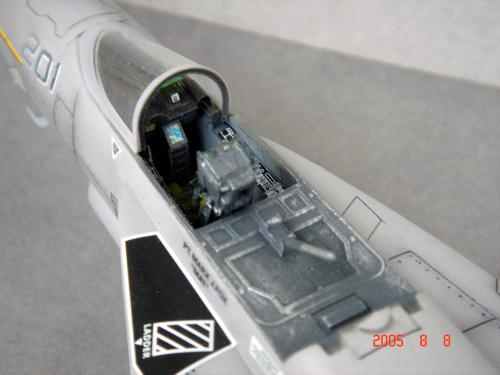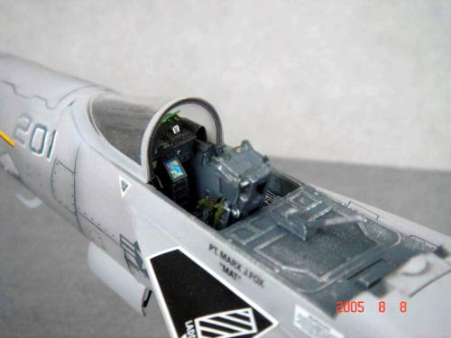 制作还行,不少小的地方偷懒了,如轮胎的合模线都没磨,起落架舱门的红色警戒色也没有;偏差有点重了,尾喷颜色可以再丰富点;坐舱的CRT是亮点,安全带要再折一下,假了点;考证上面没有细心,E是没有这个减速板的,是个大BUG |