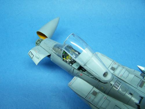 相当的不错! 有几个小地方注意一下更好: 鸡头的雷达罩上的布列天线有点稍大了,细点更好; 后视镜和把手都加细了,安全带可以再作好一点,有点假的~; 雷达的管线都加了,起落架上也可以增加刹车线; 迷彩的分割稍微有点硬; 水平尾翼上“NO STEP”的标贴的位置有误阿~~