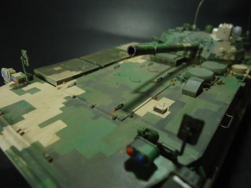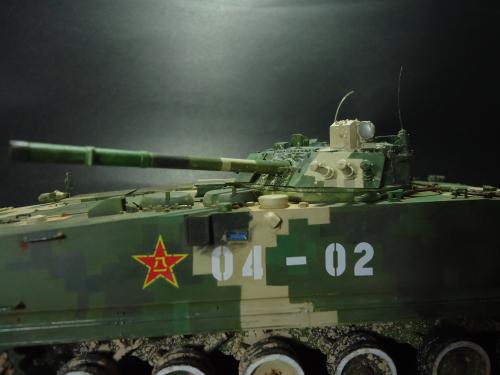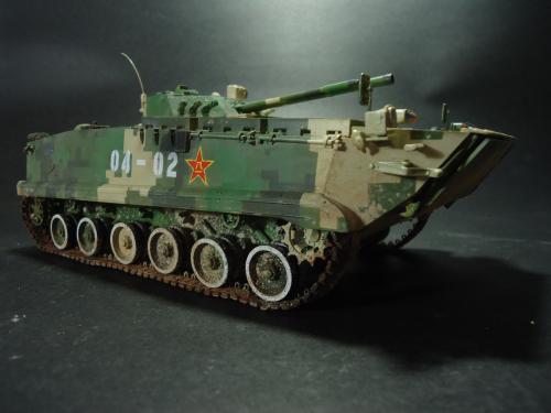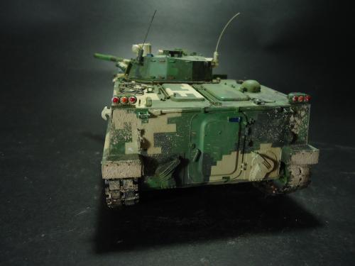 HB的板件,直做无修改,板件的组合度还是很不错,基本没有什么需要补土填缝的地方。 数码迷彩涂装遮盖让人几近崩溃^-^拖了好几个月才完成,有的地方还重新做了补漆。 经过一个月的完善迷彩涂装,整车涂装总算勉强入眼了,将涂装前拆下来的小零件上色之后装上去之后,再将拼接履带一节一节的装上,上色。 虽然做的是阅兵涂装,如果不做旧化的话,车子看上去太扎眼了,所以只是简单的做了点滤镜和旧化,再加了点泥浆效果,不过在做泥浆效果之前居然忘了贴水帖标志了,所以又只有将车体两侧的泥浆效果擦去,贴上阅兵时的方队编号。 最后总结下,HB这款车组合度和细节都很不错,价格也很公道,只是因为我平时很少做AFV,再加上这次做数码迷彩,遮盖时很费时费力,需要极大的耐心和毅力,不过做好了的数码迷彩效果是很出众的,虽然我做出来的效果还很差强人意,不过自己还是很满足了。战车的旧化对于我来说也是一个新鲜的课题,手法和技法都很幼稚,还需要多多实践。过程图比较少,而且基本是用手机拍的,效果都不太好还请各位谅解。总之就这个模型而言我自己还是很满意了。