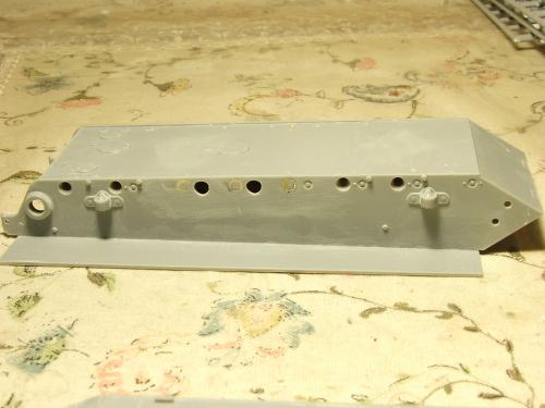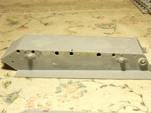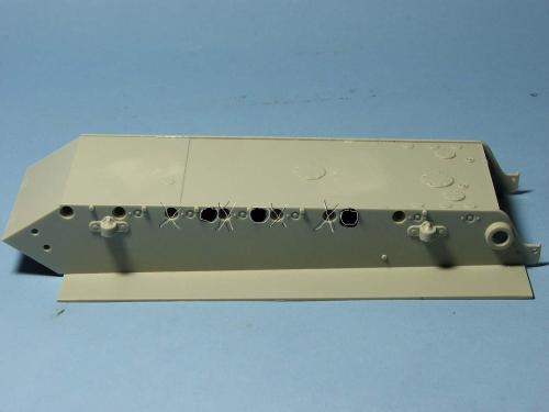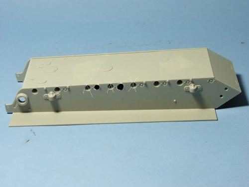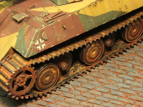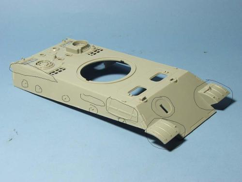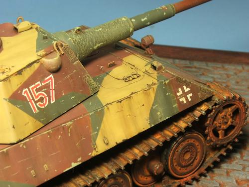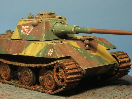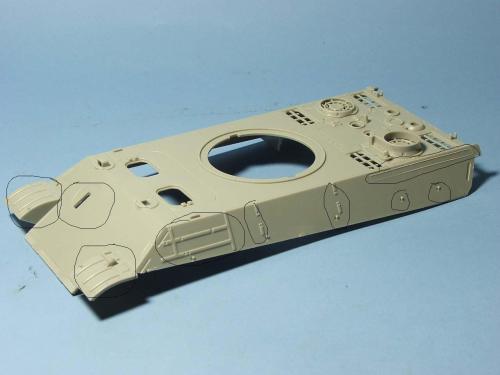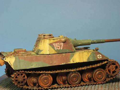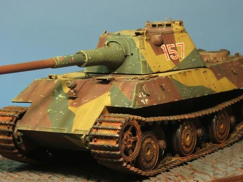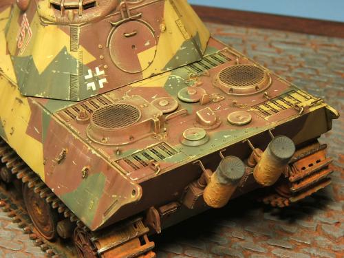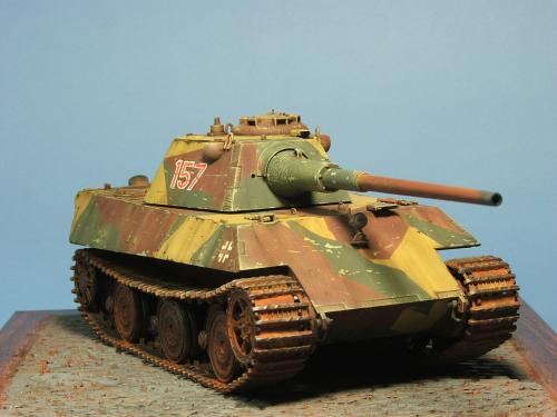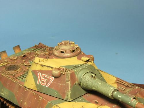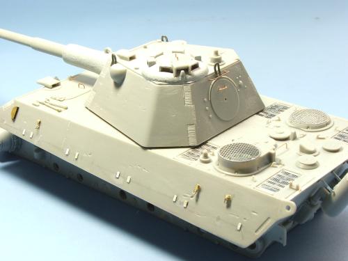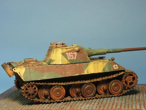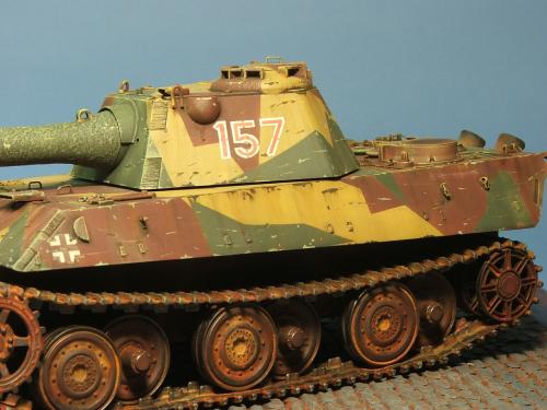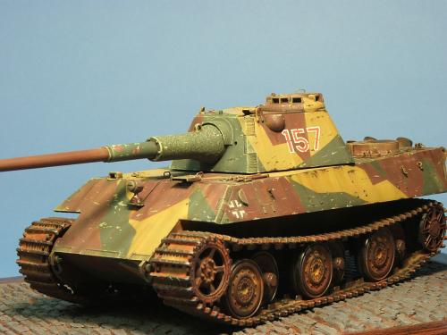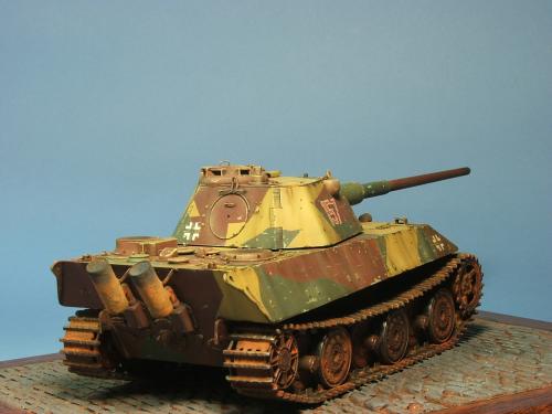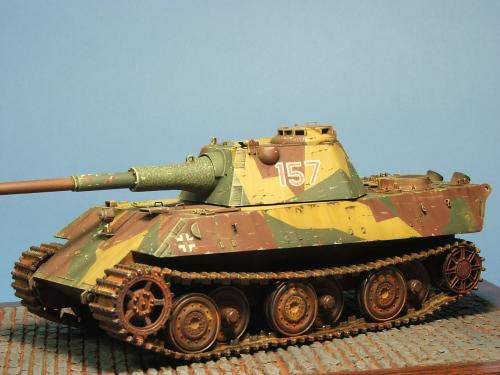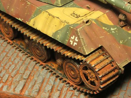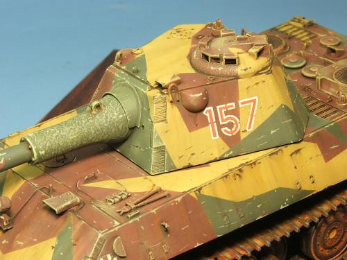 若是说德军的图纸战车,当数E计划。E系列包括E10,E25,E50,E75,和E100。E-100小弟已经制作过了。这次制作的E-50所须改造很多,对小弟是个挑战。 E-50是德国人设计的标准战车,E-50重50吨,计划取代“黑豹”.E-50的综合防弹能力比黑豹F提高了50%左右,它采用和黑豹2型一样的加长型的88炮(虎王上的88L71炮).车体共6对扭杆12组负重轮分两层排列。而普通的黑豹(A,D,G)车体8对扭杆,16对负重轮分3层重叠排列。E-50车体细节多似虎王。 这次小弟以黑豹II(龙6027)为基础,复兴E计划的主干E-50。黑豹II大概是最接近E50的战车了,他不仅拥有和E50相同的炮塔和火炮,履带,路轮,齿轮,和诱导轮也都和E50相同。 1,在车体下部打孔,填补不用的孔,把原来的7对路轮改为6对 2,填补机枪口 3,切割前泥瓦 4,磨平原来的工具扣,换用沃雅的蚀刻片。 5,把所有的把手换成合适的铜丝和铁丝。 6,用胶板制作了裙板的连接口 7,补土戳出指挥塔和炮盾的铸造感 8,用刀加深钢板切割痕。 9,在前装甲增加车灯,和电线。 涂装上采用的是硬边三色密彩,充分掉漆(点的真过瘾),洗,滤镜,扫,履带大量锈蚀,排气管烧蚀色用粉来完成。 完成后,发现还是豹味太浓。也是个遗憾了。 400多K的照片,评委放大看