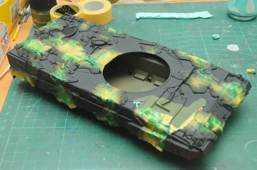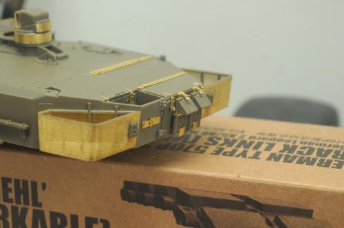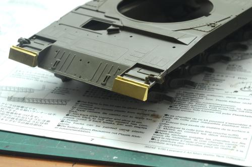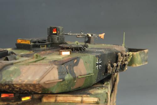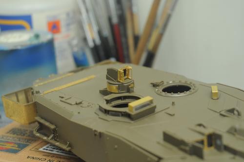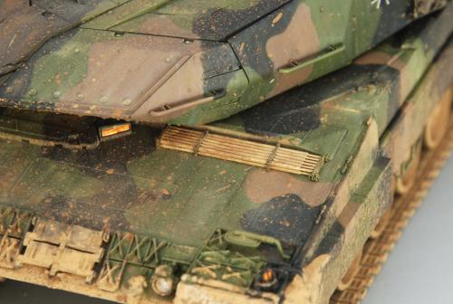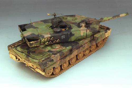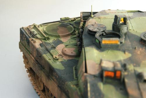 使用田宫套件,另加沃雅的pe套改、号手的活动履带和AFV的潜望镜贴膜。 制作过程比较顺利,pe的细节表现不错,特别是车身后部的表现很不错,由于第一次用潜望镜贴膜,而且AFV的尺寸也不太合适,剪剪裁裁的才勉强对付上,号手的履带感觉还行,制作也简单,装上后效果不错,可惜没有改活动悬挂。 上色使用了北约的三色迷彩,参照一张网上的照片做旧成在湿地越野后的效果,行走部分用天然土做出了干、湿泥,侧裙和炮塔表现出泥浆飞溅的效果,完成后总体感觉有些过火了。 第三次参加战车的比赛,重在参与,以后还要多多学习!