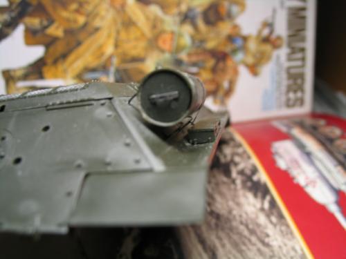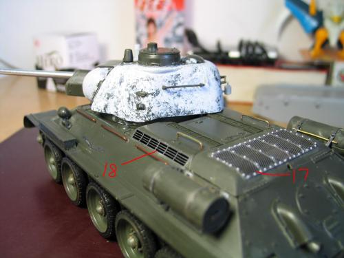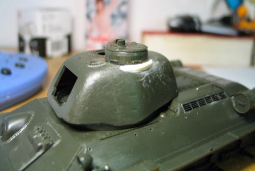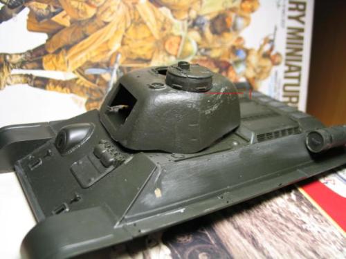 这次制作的OT-34是安装了ATO-42型喷火器的 车里雅宾斯克拖拉机厂生产的T-34/76 1943型,炮塔与一般的T-34/76 1943型不同,炮塔中部下方略微向下延伸。由于安装了ATO-42型喷火器,车体上的无线电台被移到炮塔后部,并且安装了车长指挥塔。我手中刚好有协和出品的T-34写真集,有两张该型OT-34的历史实车照片,发现其炮塔不同于一般的车里雅宾斯克生产的炮塔:指挥塔超出了原有的舱盖,要在指挥塔附近加装一部分突起;炮塔两边要加装类似T-34/85的炮塔起重吊钩;无线电台机座移至炮塔后方。