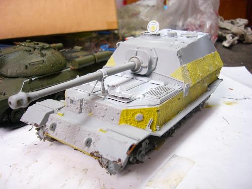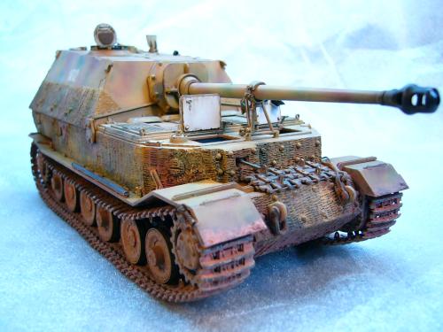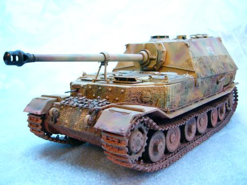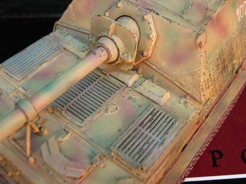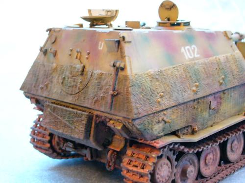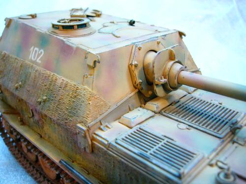 这是为场景作的,使用威龙套件,用保利补土做的防磁,履带钻孔做活动,舱盖、悬挂、行军固定架均钻孔做活动。当时懒得查资料,按封绘作的防磁,完成后发现与资料不符,只好将错就错了。用松下F-1(300万像素)拍的,效果一般,细节没法看。