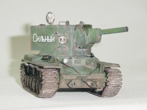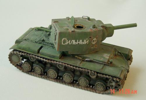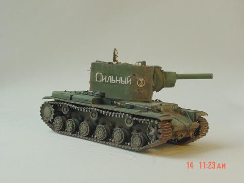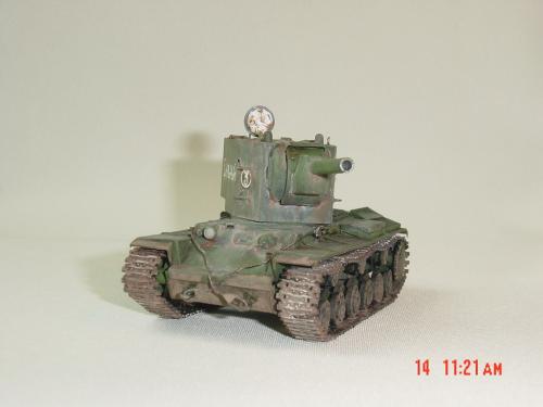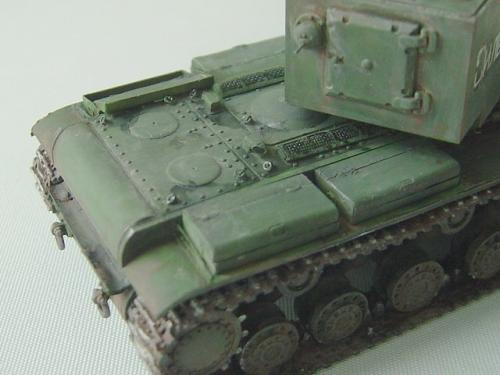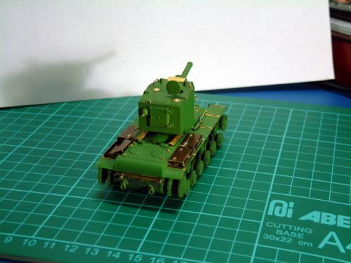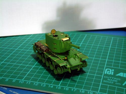 此车属于1942年7月蓝色方案开始时的布良斯克方面军第7坦克军第3近卫坦克旅的一辆KV-2。 KV-2型坦克装有1门M-10型152毫米榴弹炮。之所以采用这样大口径的火炮,其目的是为了能够摧毁敌方坚固的防御工事(譬如芬兰的曼纳海姆防线)。但这也使坦克的炮塔变得特别巨大,不仅导致车体行动不便,而且看上去宛如一个立在坦克底盘上的小房子。因此就有人给KV-2坦克取了一个不大文雅的外号“公共厕所”。 使用套材为PST No:72017的1:72系列苏军二战战车--KV-2。中途又购得PART的蚀刻片用来加强细节,工具箱、翼子板支架、进、排气口网罩、炮盾防雨罩等等都是蚀刻片,原蚀刻片的登车扶手太薄弃置不用改为铜丝制作。最精彩的是发动机盖板上的提吊环也可改为蚀刻片还是可动的。152MM的炮管和拖曳钢缆为老熊提供的金属炮管和铜丝缆绳。PST的板件组合度不错细节尚可,大量的蚀刻片的处理是整车的难点,1:72的蚀刻片十分细小,花了我大约一周的业余时间处理。但完工后效果的确不错。 在上色处理时先喷底色,在喷郡士的苏军早期绿,采用滤镜法渍洗后,又尝试用新购得的天然土再做一遍滤镜旧化。包括底盘、履带、车轮的泥污,发动机罩、进、排气口上的油污,整车的锈痕,整车混色。拍照时天气不好影响了效果大家见谅。另外PST的水贴纸质量不是很好也影响了旧化效果。 整套模型耗时约3个月时第一次尝试1:72的战车蚀刻片和天然土旧化技术的使用,希望大家多多指正。