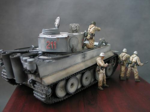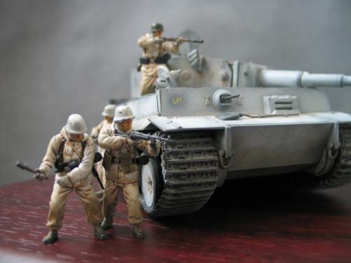 在制作中如果能加上补品,会极大提高模型的精细度。做为雪地涂装不能只用简单的灰白色来表现。德军坦克的雪地涂装通涂是手涂的,所以也是不规则的。兵人在旧化时不应只用棕色来处理。同时若能配一个简易的地台会好一些。