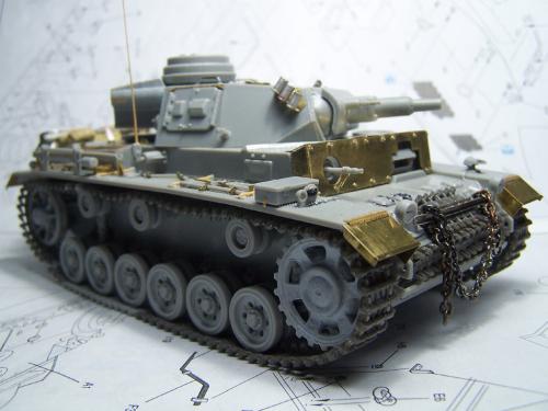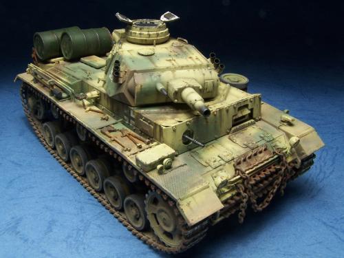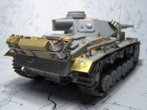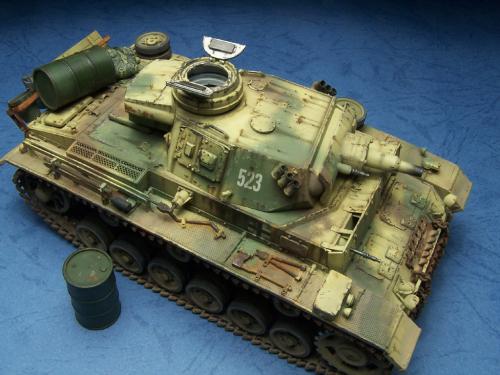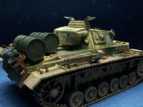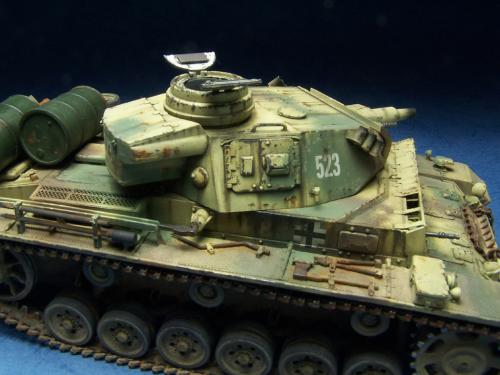 使用了港龙的3号J的车体和一支多余的3号M/N套件内的75MM炮管,另一套沃雅专用的蚀刻片。重新焊接了装甲,并用铝片制作后扰流板、杂物支架和小水桶。上色花了不少心思,住要是喜欢重洗,所以用洗液描绘了很多次,钢板的磨损用粉彩黑色制作。其他似乎和别的模友手法一样,就不罗嗦了,平时很低调,这次斗胆参加一次比赛,权作是响应周围朋友的怂恿吧!