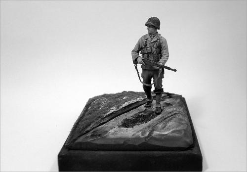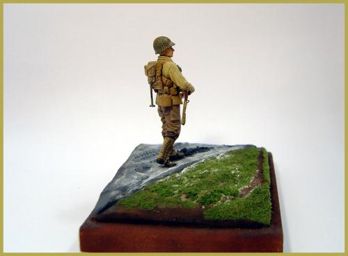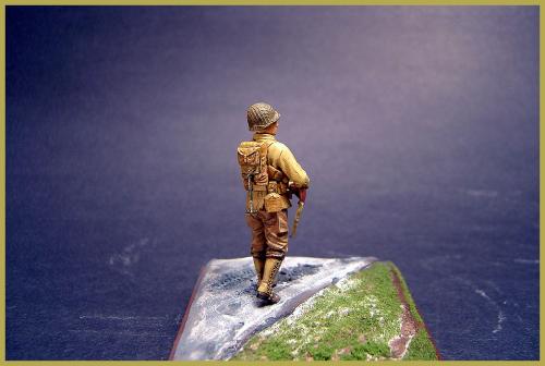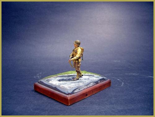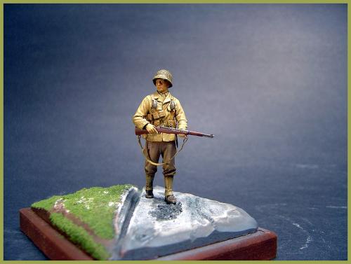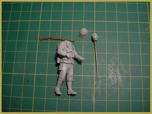 第一次参加兵人制作比赛,这次来凑凑热闹。 材料准备: 兵人制作对我来说算是一个陌生的领域,在尝试了几次制作之后,决定认真来一次。选定的是威龙的一套美军士兵6236,老货新版,里面提供了很多准备,人头等之类的东西,不过都是垃圾。所以又选了一套田宫的美军装备35206,细节上还可以。主要是这样下来价格挺便宜。如果以兵人为主体,没有一个小的地台衬托是不行的。还要准备石膏和草屑,这些都是在专业火车模型店找到的材料(虽然我经常说可以这样做地台,但这次还真是第一次试验)。 制作: 原打算做3个兵人,但是由于学习和工作的关系,缩减为一个。这样工作量少,就可以更专心做了。组合上很简单,身体组合完上君氏的补土。脸部单独上色。用石膏粉混合水用木筐定型制做地台。地台是路面和草地2部分。先给地台上色猛然后铺草屑上去。在路面部分用履带或者车轮在地表压出痕迹。 完成: 一切之后就是上色。兵人模型我不太在行,写的不足之处大家指正。呵呵,请大家继续往下看。