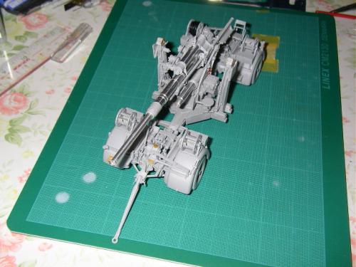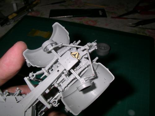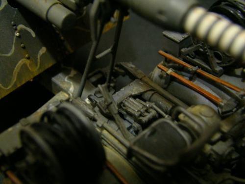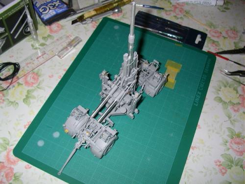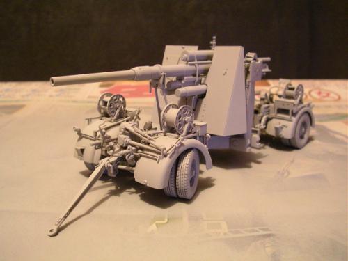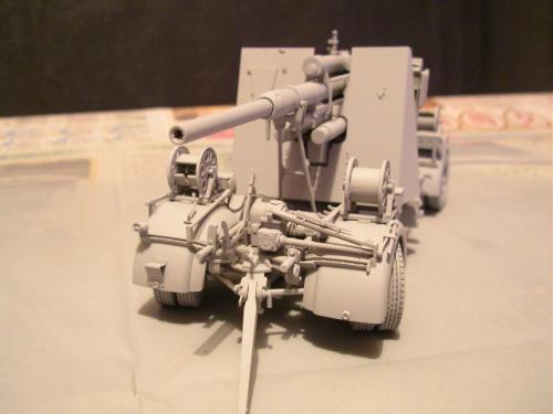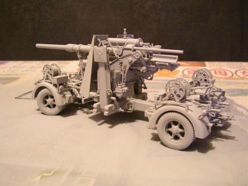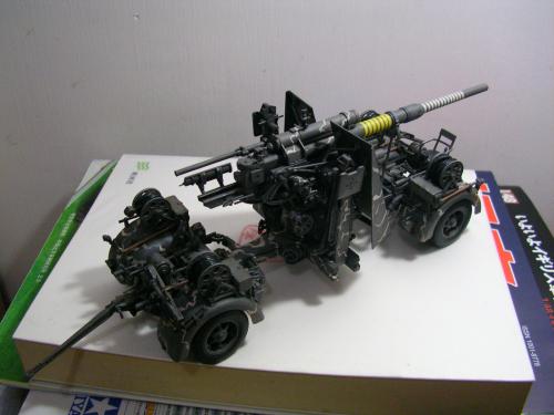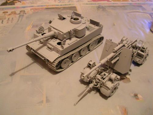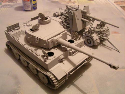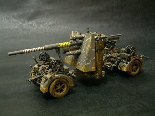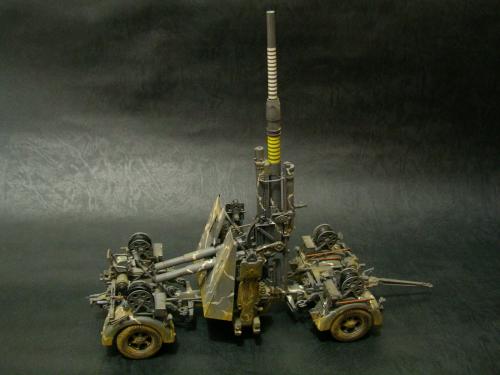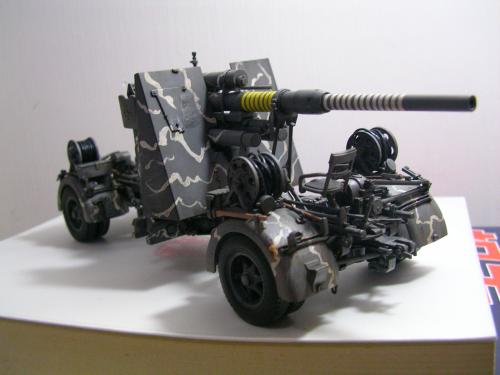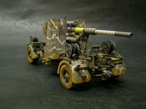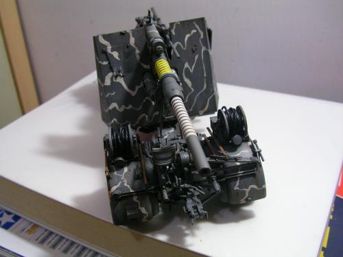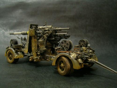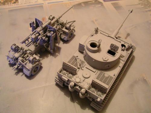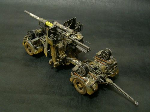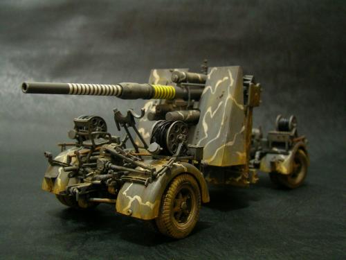威龙的88mm高射炮 Flak36, 因为小弟在8月开工, 那时候市面还未推出蚀刻片补品, 所以基本直做了事. 改造部份为部份手柄零件以铜枝自制, 以铁丝自制炮膛线, 将说明书上表示要黏死的车轮改成联动的, 工具扣以沃雅工具扣蚀刻片代替. 索组完毕先上郡士1000号水补土, 德国灰涂装, 用的是调浅的田宫水性D国灰, 喷色偏差, 白色迷彩手涂, 炮盾正面迷彩参考龙说明书上的, 其他部份yy, 其他零件手涂上相应颜色, 水贴不多, 本来的白色猎杀环觉得太多了, 剪短一些. 旧化先用黑褐二色油画颜料渍洗, 滤镜, 点掉漆流锈, 特别一提是车体上的刮痕真的用刀尖刮, 线条幼细效果真不错. 最後以天然土抹上泥尘就大功告成~