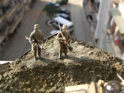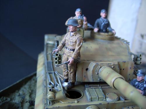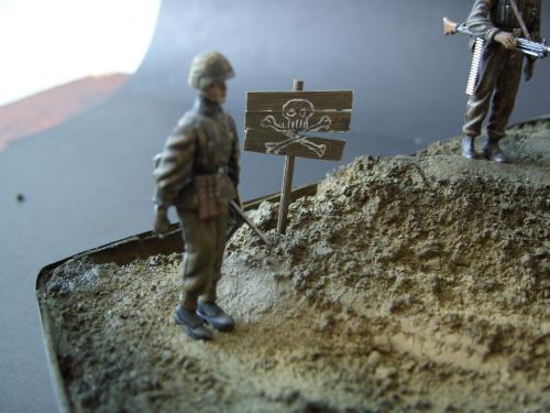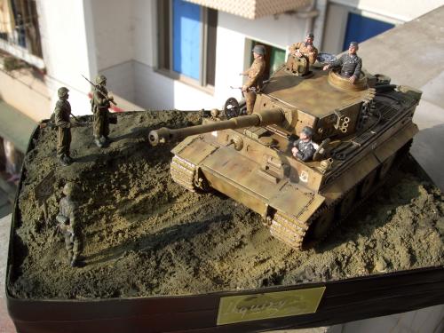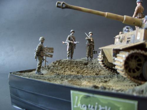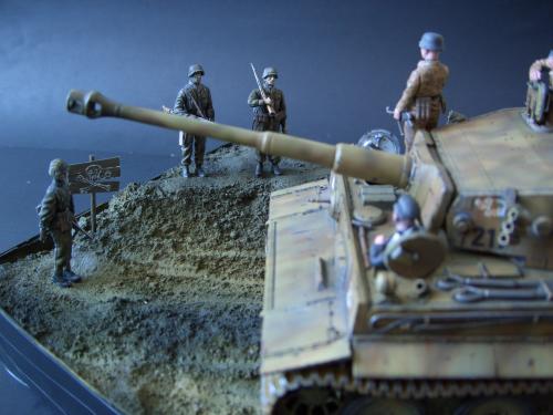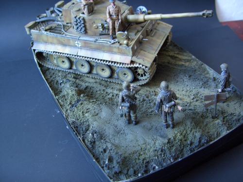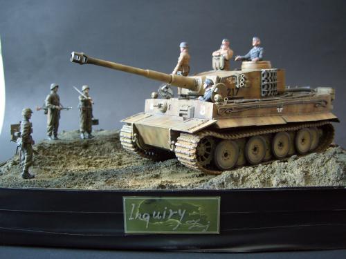 采用爱德美的1386套件,没有使用蚀刻片,只简单的追加了前灯的管线,侧裙板自己手工切开分别安装,追加了炮塔和前车体的焊缝.全车素组,完成后顺便做好随版件带的兵人,最后索性加了几个小号手的兵人组成一个小场景,没有经过考证,自制警告路牌,纯属YY.作品名为"询问",其意为:一辆坦克正在行进,突然发现前面路旁的警示牌,正犹豫间,刚好遇到几名满身征尘,经过一场恶战的士兵,于是车长令手下询问前面的情况.(本人从事模型制做仅六个月,本着学习的态度参加这次比赛,重在参与,还望老师多多指出不足.)
