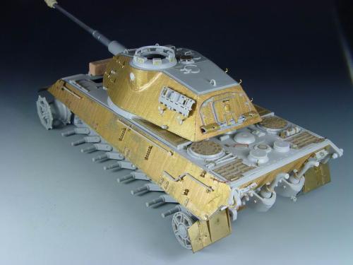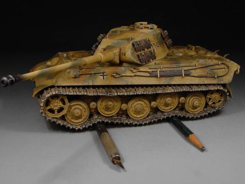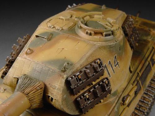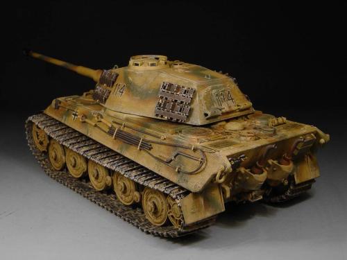 这次比赛是88主题,我也可以把烂尾一年的虎王给解决掉了。去年在绵阳学习时,虎王的索组就已经完成了,改造的重点是活动悬挂、履带和蚀刻片加细。后来觉得需要加做防磁,可是所有蚀刻片都已经沾在车体上了,难度很大啊。没有办法,用防磁蚀刻片吧。从新时买的牛魔王片子,在车体上沾好后,加上银色的金属炮管,整个虎王金光闪闪,富贵逼人。看得眼花,怎么也舍不得上色了(模型加上炮管、蚀刻片、防磁片子和金属履带,整个虎王价值400左右了)。 上色参考了说明书的彩图,就做114号车。几种颜色都是自己用君仕漆调的,现在感觉好像艳了点。旧化整体先洗再扫,在没防磁的地方做滤镜,然后描掉漆。这次没用天然土,而是用了真正的黄泥。可惜好像效果不是很好,黄泥浆干了后容易结在一起。哎呀,试验失败了。