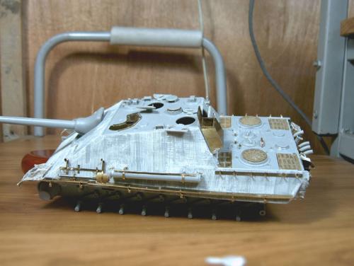 本人使用的是威龙的猎豹模型:编号:9012,配的是沃雅35015:1/35 二战德军猎豹歼击车蚀刻片升级套件和35028:1/35 猎豹系列侧裙装甲蚀刻片升级套件,此车为威龙的早期版件,开模一般,细节还将就,不过有不少错误,这次做的时间比较长,所以基本能用的蚀刻部件都用完了.总的感觉这个片子还是不错的,针对的都是威龙早期不足的细节.
