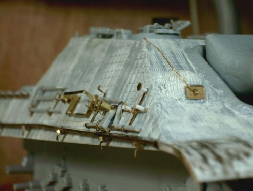 1.组装完后先在蚀刻片上喷涂金属底漆, 2.上1000号水补土, 3.用2号黑色喷底色, 4.上砂褐色,上的基本色是自己用郡士和魔王漆调的,旧化后颜色会变谈,所以明亮度需要大点,喷的时候留出阴影,然后再加白色喷出高光. 5.用象牙黑泽洗, 6.用灰色点出掉漆 7.用土黄,赭石色,橄榄绿,棕色等做滤镜 8.用银色黄色加白色在部分突出处干扫 9,最后上粉彩,消光.