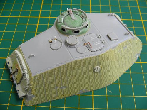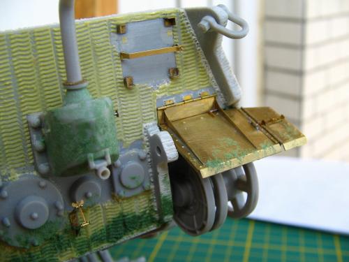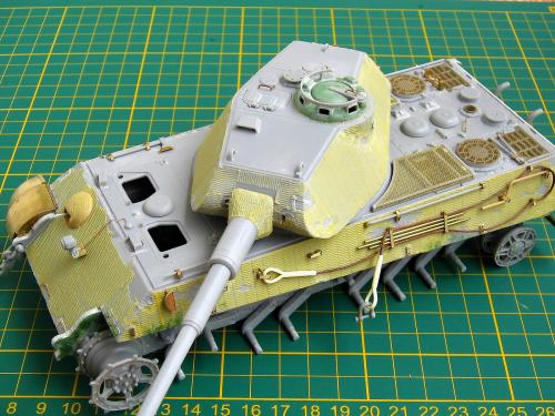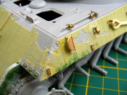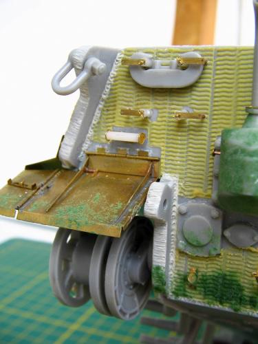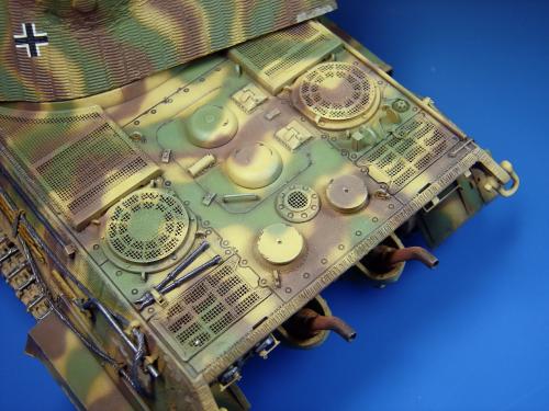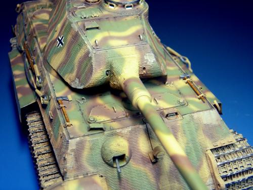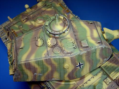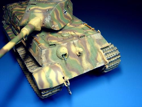 使用的套材: 这次制作主体是龙的6189保时节炮塔之虎王。其中车体两侧的钢缆,侧面的群板以及炮塔后门上的手枪射击口栓塞均为Voyager Model的模型改造补品。整个模型还用到了其他蚀刻片厂家的部分剩余零件,同时使用了Metal Hobby的金属履带。 改造要点:在模型组合阶段进行的改造如下: 1)可活动的悬挂结构 2)全车细节均进行蚀刻片改造 3)坦克外部所有可活动的门,都改造为活动结构。(包括炮塔顶部的抛弹口/信号弹发射口) 4)全车铺设水泥装甲,为了打破单调,做了适当的脱落。炮塔首上水泥装甲的防磁纹理参考了一辆实车照片。 5)所有明显的地方都追加了焊接痕和气割痕。 6)前后挡泥板都做为全可动结构。 7)炮塔后门是全车改造的重点,完全按真实的结构复原,同时改正了和后门连接的装甲的厚度。(注意!通过结构图可以看出,此装甲是“镶嵌”在炮塔后装甲上的,即此装甲板裸露在外面的厚度仅仅约40mm,而实际厚度为80mm,只有在后门的开口处断面才可以观察到。 8)扩大了车长观测塔上的潜望镜窗口,原件太小了。 9)打薄了排气管口,同时对保护其的装甲缸“缺口”形状进行修正。 8)追加车头2侧的终极减速器的保护装甲的焊接痕迹。 改造点未能尽述,请参考“裸照”。 全车PE使用乐泰胶水粘合,部分零件考虑了强度问题,结合使用了焊接技术。如:车体前后挡泥板为全焊接结构,铁锹头的固定具,千斤顶的固定具等。虽然焊接颇费时间,但是完成后的效果和强度都是很让人惊叹的!炮塔后门为全车改造的重点,施工参考了一张后门的结构图纸,由北京杨林提供,在这里再次对他表示诚挚的感谢! 涂装设定:制作的历史背静设定为1944年投入在法国战斗的503重坦克营的保时节炮塔虎王。涂装设定为3连比较有代表性的“虎纹迷彩”。当年的T社和福万都用这个迷彩做了封绘,可见其魅力。当然此迷彩的难度也比较大。所有颜色均使用GUNZE的油性涂料,用500号水补土打底。按照真实的涂色顺序,先喷涂暗黄,然后做暗绿和红棕的迷彩条纹.防磁脱落的地方采用了浅灰色打底,原因是参考了大量历史图片和一些艺术效果图.由于赶在比赛结束以前提交作品,所以后续的旧化细节和拍摄方面还略显草率,整个后续的涂色和旧化用了7天的休闲时间,实在是很赶.在车体的考证方面其实参考的是324号实车,但是苦于龙没有给这个水贴,同时我也按照自己的理解在迷彩纹路方面加进了自己的设计,也许这就是模型的魅力!最后索性放弃了车号.