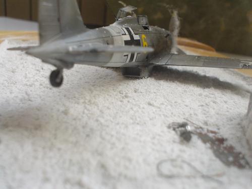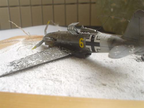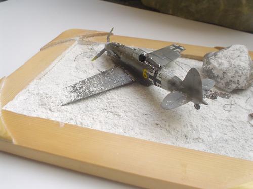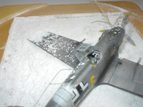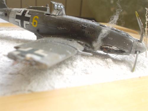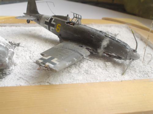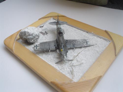 意大利的板件,制作上不算特别愉快,但基本还是比较顺利得完成了.制作到最后不幸遗失了透明件,只好自制.相对于原件,外形可能有所偏差,但能更好地表现厚薄(原件实在厚得可以了) 全机加深刻线,并根据线图补出机翼上的刻线和铆钉. 坐仓中,追加了管线和安全带,并用补土表现了坐垫. 机炮仓排气口使用电烙铁加深后塑型,取得了更好的表现效果.尾轮处两块起落架仓盖用铜皮替换,原件太厚弃之不用. 改造的重点在于三处内构的表现.翼根,翼尖和发动机仓.发动机使用铁丝、铜丝、铝薄、胶板、流道自制。效果还算不错。另外两处内构是用刀笔抠开后追加铁丝、铜丝表现的。天线将其折断,表现迫降损毁状。同时,螺旋桨全部向后弯曲,并抠出破损。制作和改造基本在五月完成。在机身侧面抠出弹洞。上色已经是六月底的事了。 照例全机喷1000号水补,涂装没有采用说明书上的几种样式,而是参考了资料,决定做一架德军装备使用的MC-205。于是特地买了一架爱的BF-109,使用里面的水帖纸。比较失望的是里面没有万字……而根据资料,垂尾上是有万字标识的。 喷涂完毕后上水帖、点掉漆、洗、上粉、消光,不用多说~ 最后流道拉丝拉上天线!~飞机制作告一段落。(据说MM的头发效果更好:) 与飞机同时开工的还有地台,拆了个相筐,(放毕业照的,心痛ING……)抹上白胶,撒粉笔灰。。。。PS。那块石头是皇居,也就是天皇皇宫门口拣的,嘿嘿