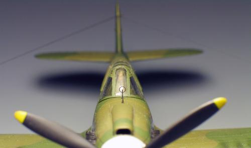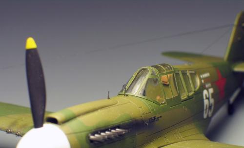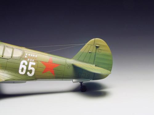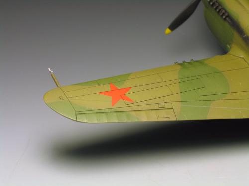 所有红星全部遮盖喷涂,“65”用战车里大小合适的水贴,战绩标志用的是爱得美1/72P-39Q里的,没有黄色的,和照片里就这点不符吧。后来发现第三方有水贴可以替代,无奈已经完成,留下了一点遗憾吧。最后使用了牛魔王出品的1/72的盟军机炮瞄准具给这件作品增色不少。尾垂到机翼2根线、到座舱1根线,标准P40天线布局。