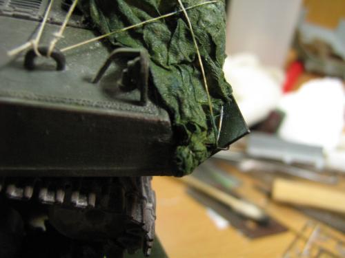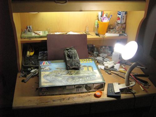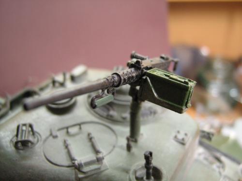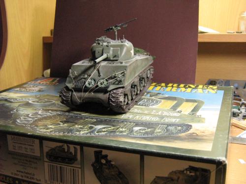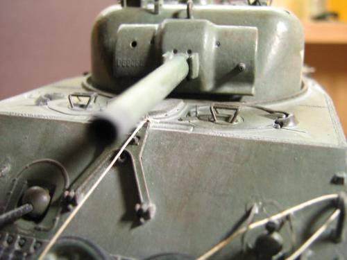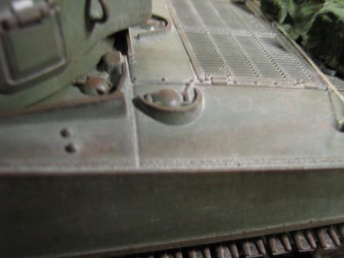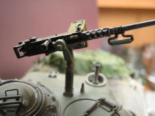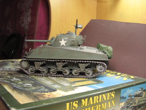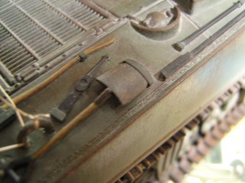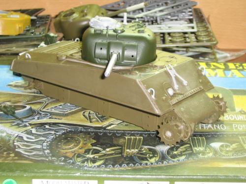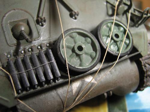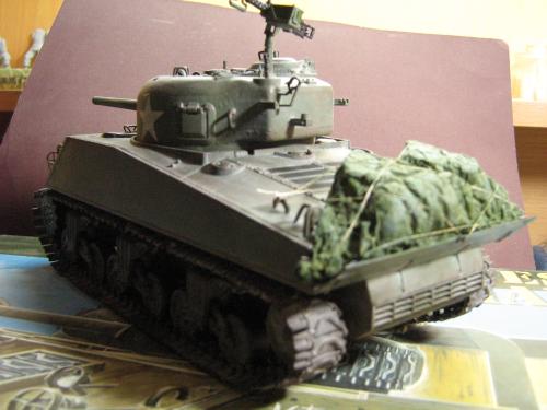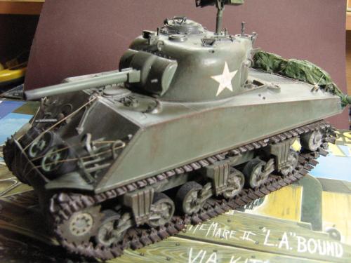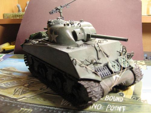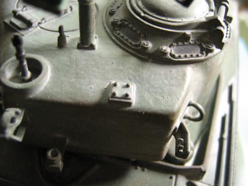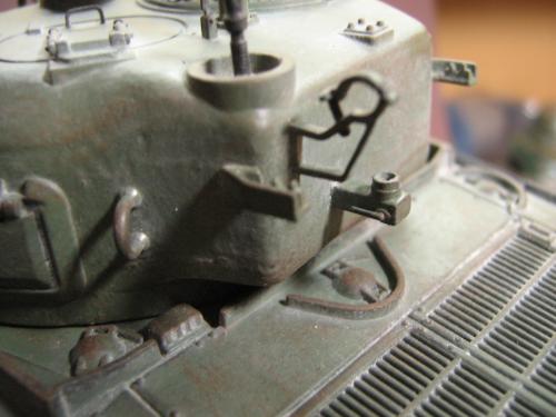 意大利的炮塔错误太厉害,舱盖小了一圈,直接废弃,选用了爱13203的炮塔,爱的指挥塔太高,换上了龙6121中多余的指挥塔……改造了龙M4系列中经常出现的T62履带为T54履带。全车狠扫,没洗,上了点儿土来模拟城市作战中经常出现的混凝土灰尘,改造了车尾的支架,按照日本模型制作片里的方法做了车尾的杂物~新手,第一次实战,好歹还是整出了一辆战争最后阶段,在德国城镇巷战中坚持的M4A3(75)W最后期型~