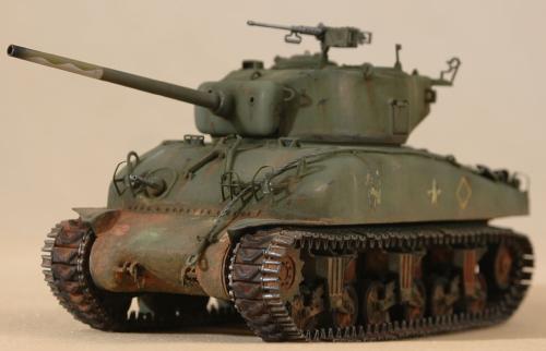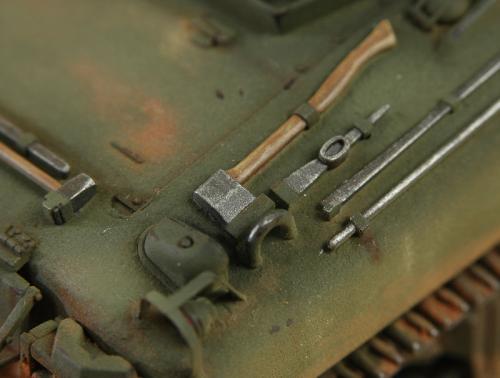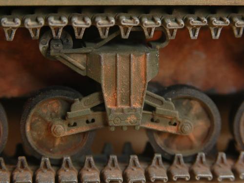 本作品选自龙6083套件(USSRSS出差时帮我带的^_^),此套件组合还算不错。副送了金属JJ和一小张PP(为模型曾色不少^_^)。 制作主要采用田宫和仙盈的水性漆来喷涂,采取了预制阴影、偏差色、渍洗、干扫、掉漆、流锈、 天然土(YZJ自制的^_^)、粉彩等传统手法制作。 细节方面主要是采用套件给出的蚀刻片进行追加灯罩部分等,还使用灰补土对炮塔的焊接线和铸造感进行了加强以及一些组合问题进行填补。 由于仙的水漆颗粒大了点,所以没有使用油画色滤镜法对单色涂装进行丰富,而采用了粉彩使色彩有些变化(推荐樱花粉彩附着力不错)。 通过此次制作,使我明白了要做好一个模型我要走的路还很长……