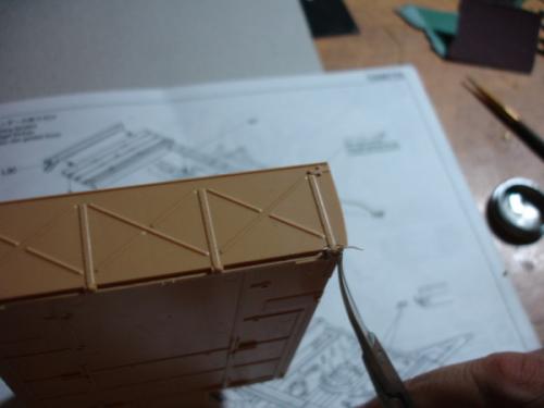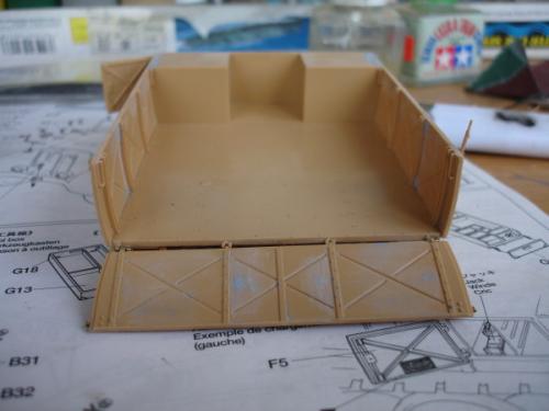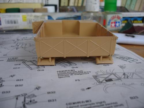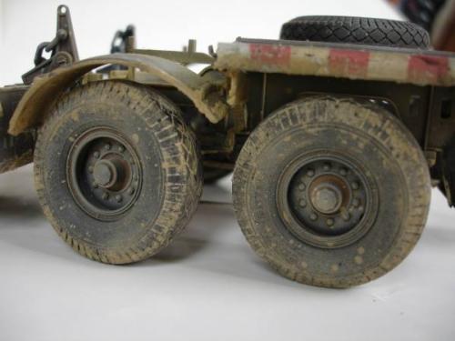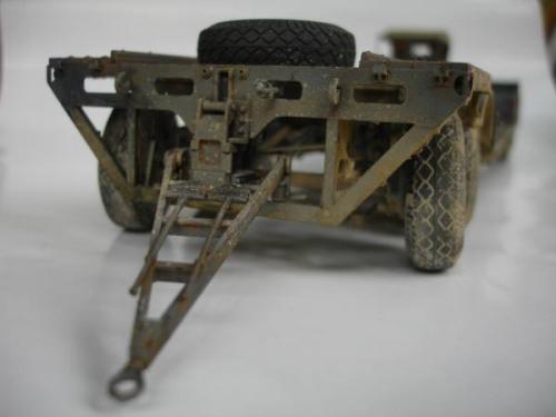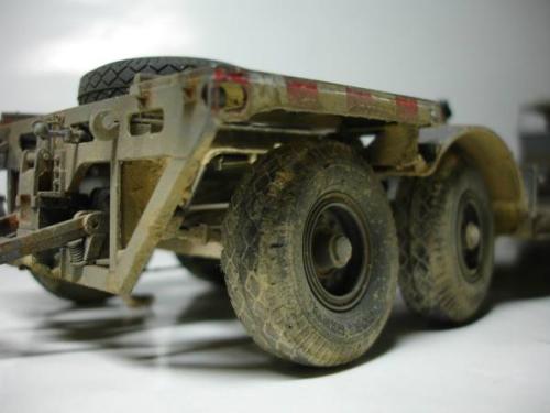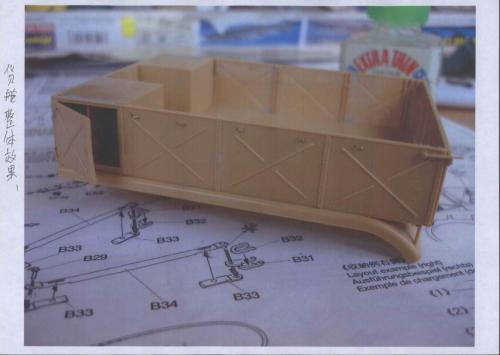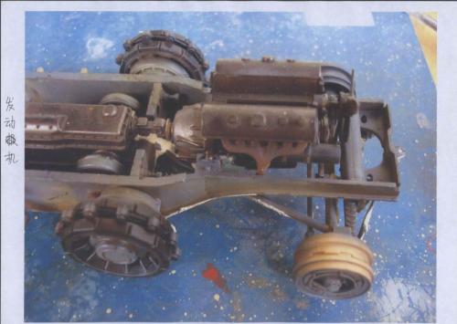 初步组装 总的来说,这是一款非常让人得心应手的模型,其塑造精细度相当完美。尽管如此,却也无法避免一些小瑕疵,适当的假组合能避免很多一次成型的错误。在货舱,发动机零件等方面,要精细校对,再组装。 通过一个月的辛苦工作,剪切,砂线,假组,粘合。。。。。。如此反复进行,车架,发动机,压缩机,绞盘,驾驶室、运输台底板,钢轮,平板等部件的组合终于完成。