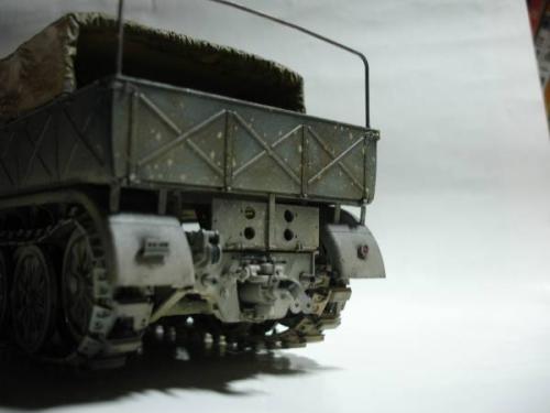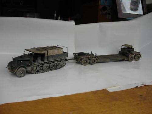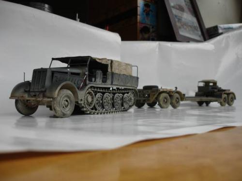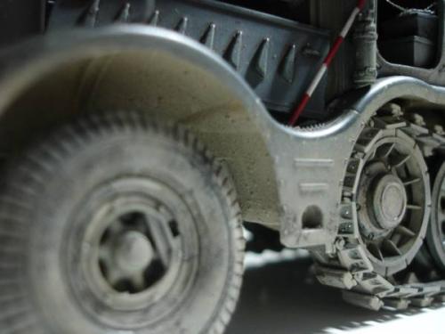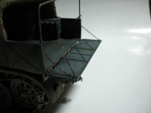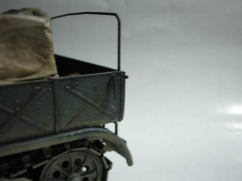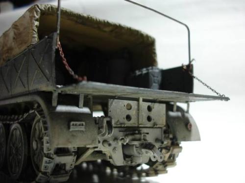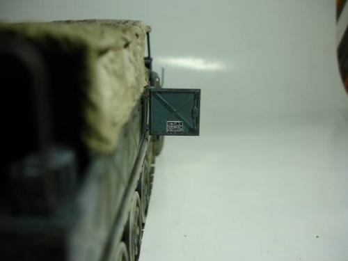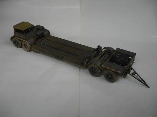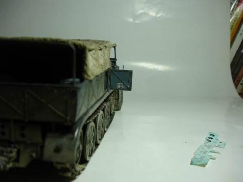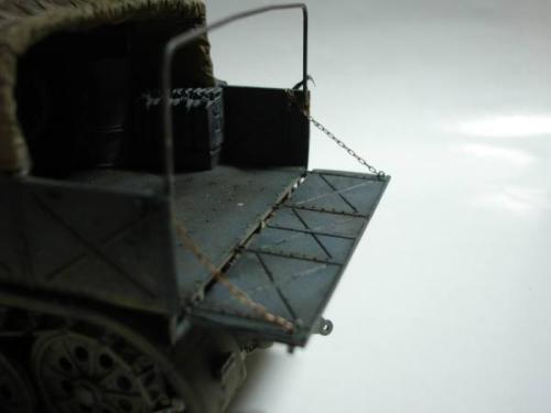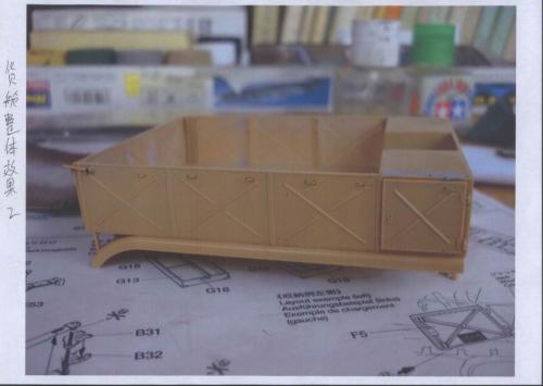 使用套材: 田宫 18吨半履带战车搬运车及平板 辅料: 田宫 胶水 滴缝胶 遮盖纸 补土 塑型补土 油漆 郡士:补土 油漆 草纸 铜丝 PE: 沃雅 二战德军战车辆工具固定扣改造蚀刻片 沃雅 ME-A004 18 吨系列用 示宽棒 沃雅 二战德军车辆紧固锁扣 废片自制 FAMO通用改造件 细节: 车头车蓬挂钩的重塑 车头追加帆布车蓬 所有可活动机关的改造:驾驶舱 工具舱 货舱 车头改造:门链 工具固定扣 步枪支架 步枪扣 改造随车工具 示宽棒 平板改造:工具锁扣