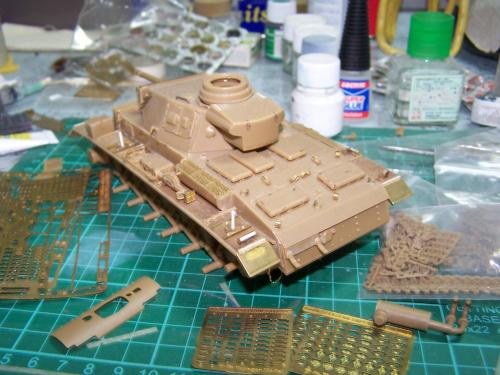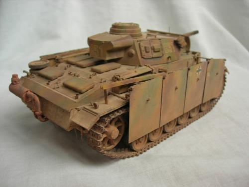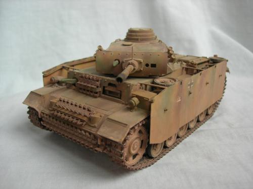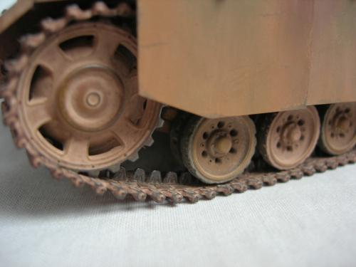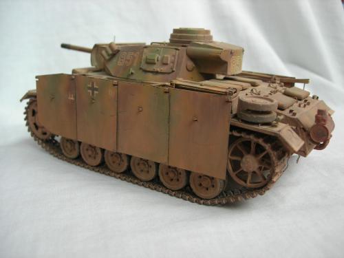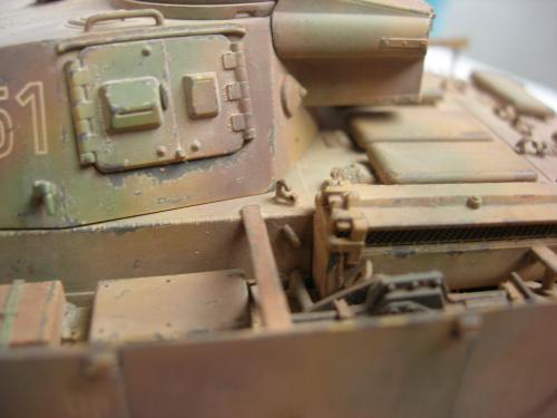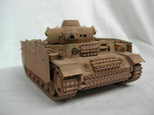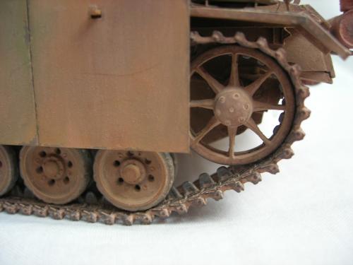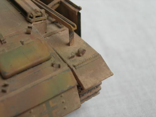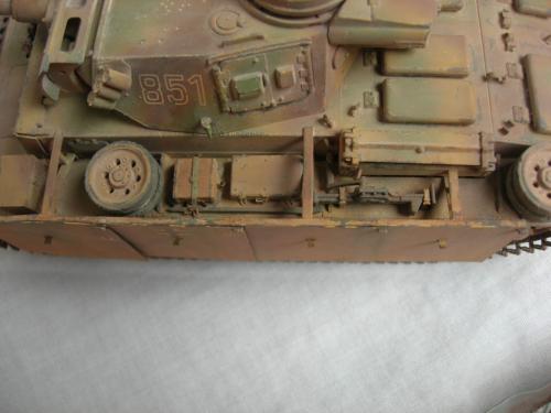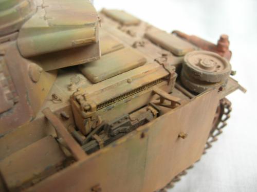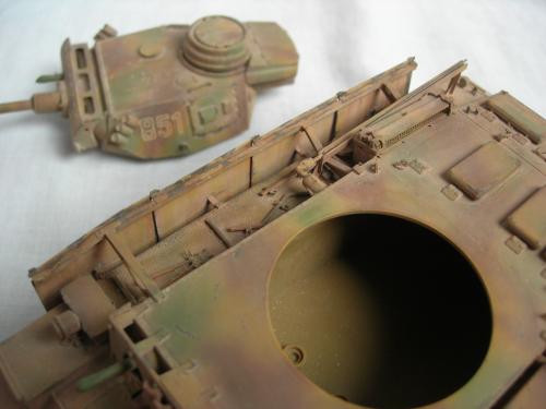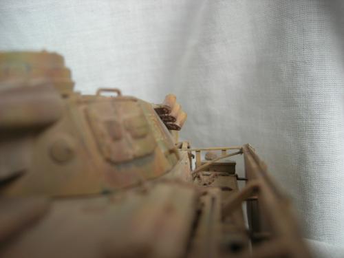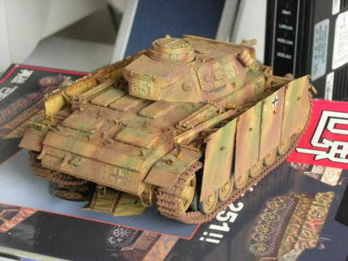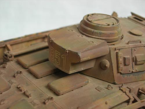 这款是郡仕包装的产品,大约是2004年左右在sonicbbs上从陈朴先生那里淘来的,然后一直烂尾至今。恰好有这么个比赛,查阅了一些资料,在1943年7月,隶属于第6、第10及“大德意志”装甲师的41辆Panzer III(Fl)参加了库尔斯克战役,于是就把灰尘扫了扫拿来参赛了。 首先要确定作哪辆车,由于参战的数量不是很多,实在是不好确定涂装和战术编号,说明书上的是意大利战场涂装,那辆F24和他的兄弟F23都是被俘虏的。找了许久在第一版的装甲战彩上找到一幅库战中的III号喷火坦克,第6装甲师的851号。照片上能看出851号喷涂有迷彩,但是看不出究竟是双色还是三色迷彩,考虑到第六装甲师隶属于南方集团军,南方少植被,战车多数是在黄色底漆上喷涂红褐色迷彩,于是打算做双色迷彩。但是接着在Osprey社的《Flammpanzer - German Flamethrowers 1941-45》和Wydawnictwo Militaria的《Flammpanzer》两本书里找到了这辆车的两幅侧视彩图,迷彩纹路虽然不太一致,但却都是是三色迷彩的,那就做三色迷彩吧^_^ 整车用了VM出品的III号M/N型PE,当初是在益智林里受a4老大怂恿买的,这款PE是VM的早期产品了,尽管蚀刻的车体前间隔装甲很抢眼,但是对细节的把握不是很好,很多应该有的细节都没有表现,如果换成现在的话多半会作出全结构能活动的挡泥板来吧,呵呵。个人觉得整套PE最有价值的就是两侧翼子板上的防滑板了,做过龙III号M/N型的同好应该都有体会吧。 VM的挡泥板铰链是平面的,很失真,用胶棒把截面削成半圆形粘上,然后用蚀刻片锯锯出凹槽。部分零件换用了狮鸣的3突零件,比如挡泥板内侧结构和钢缆固定具。车体后下部又加了牵引挂钩上的插销和锁链,用蚀刻片的边角料制作了车体前部的履带架。看了很多照片,炮管上的瞄准具位置有前有后,851那张照片上看起来似乎在炮管根部,于是切除原套件上的瞄准具,在炮管根部钻孔用铜棒重做了一个。 照片里大多数III号喷火坦克都是没有侧面附加装甲的,唯独851车身加挂了附加装甲,但是炮塔上却没有,于是另外订购了VM的III号附加装甲装上。 照片上851号的机枪上都套了套子,用补土自制了一下,做得不太好,时间来不及了,以后有空重新改一下。 套件的履带不是很好,每块两个推出孔比较烦人,组合也比较紧,处理它们花了不少时间,不过拍出来的照片里颜色看起来有点像MK,咔咔。这款履带的诱导齿没有镂空,但却是符合实际情况的。 接下来就是涂装了,由于两个侧视图迷彩纹路不一致,索性随手喷了个迷彩。把气压调低漆调稀,本打算表现照片上那种杂乱不均匀的喷涂效果,不过最终的效果还是差强人意,还要继续努力啊。接下来就是标记了,两张侧视图上的伪装师徽都是黄色的,但是装甲战彩上说是白色,看照片感觉似乎颜色很浅,而且黄色的师徽多用于德国灰底色上,黄底色上多采用白色师徽,刚好手头龙的251里的水贴有两个白色的党卫军第2帝国装甲师的伪装师徽,和这个很相似,稍作修改贴上就行了,铁十字用的也是251中的水贴,C记的水贴还是不错的。炮塔上的851编号是白色空心的,于是又翻箱倒柜一番,找出龙的I号非洲军的水贴,刚好有这个样式的编号,0-9都有,也是C记的,终于发现龙这个备用零件贩子的好处了,哈哈。至于侧面附加装甲上和驾驶员窗旁边的Op标识和星形标识就只能手绘了。喷涂轮子的时候先喷了外圈的胎黑色,然后用狮鸣的飞机刻线模板遮盖喷中央的黄色,效果不错^_^ 再接下来就是渍洗滤镜掉漆锈渍上土,前面写太多,实在有点累了,有空再补上吧^_^ 由于单位搞611工作制,每个星期只有一天休息。整个进度拖了很久,直到10月28号下午才完成,结果碰上下雨,拍照实在是没办法,颜色比较暗了。可惜今天是截止日期,没机会重新上传了。