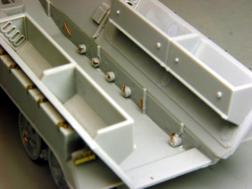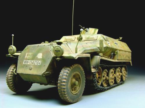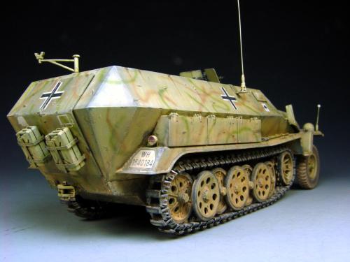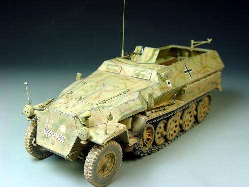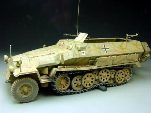 由于搬家的原因,好长段时间都在收拾家里。紧赶慢赶,今天终于完成了作业。因为是库尔斯克题材,所以选了251C。模型是号手的板子,配了沃雅的片子。因为龙那款很出色的活动履带,所以改造了活动悬挂和活动主动轮。在桌子上推作小小的251前进,履带和悬挂活动自如。可惜转向轮不能滚动,确实遗憾不小。由于赶时间(还要参加SM时代杯比赛),涂装和旧化没什么大的动作,一切都是老规矩。个人觉得负重轮旧化缺乏变化,比较单调。
