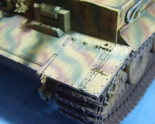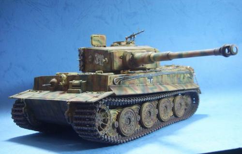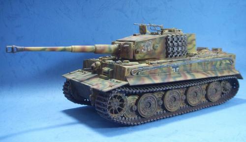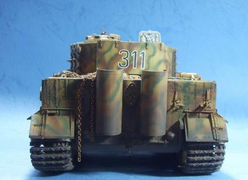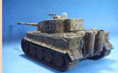 使用的是AFV的35079后期虎套件和沃雅的35056配套蚀刻片。 为了表现AFV的活动悬挂,用田宫的后期虎中的拼接履带替换掉原套件中的橡胶履带,并手钻自虐一周,完成活动履带的制作。 防磁装甲采用田宫灰色牙膏补土和田宫防磁刮片完成。 前后挡泥板的蚀刻改造件细节相当丰富,几乎是一大亮点。 套件中给出的钢缆纹理几乎丧失,不得已,只好用耳机线改造出来。 最大的难点就是前后挡泥板中的折页的制作,着实费了一番功夫。 素组完成后,整车喷一遍金属底漆,1000号水补土一遍,然后就是迷彩部分,由于购买的0.2MM喷笔还没到货,只好用0.3MM的喷笔来喷条文。气压调到最低,出漆量也调到最低,这时的条文还是比较纤细的。 条文迷彩的绘制比较随意,大多考虑的还是美观。 考证部分: 从网上获得的资料显示,311号战车是503重坦克营第3连第1排指挥官中尉Von Rosen的座车。 诺曼底战役(1944年6月11日)Gibreville的一次遭遇战中,Von Rosen带领他的排击毁了英军的12辆坦克和4门反坦克炮,并且还俘获了2辆英军的Sherman式坦克。