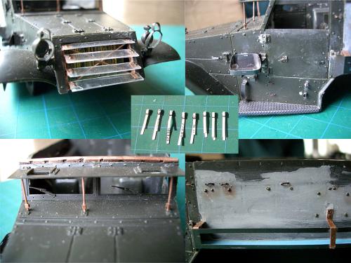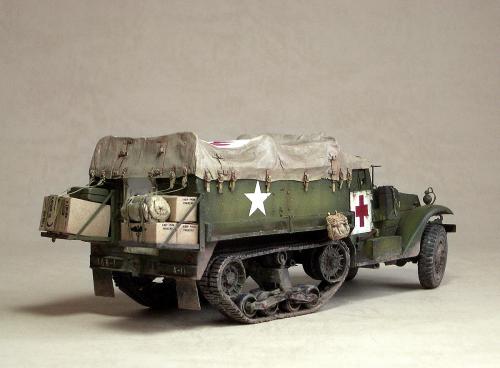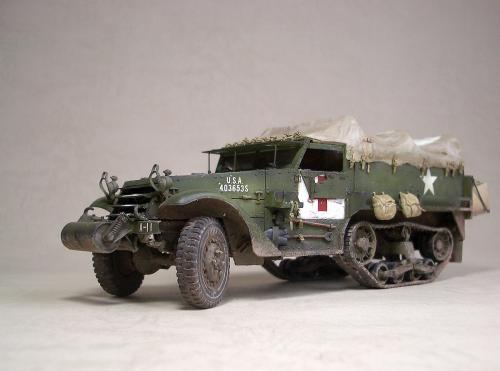 M3系列半履带车辆被广泛的运用于二战的各大战场,她独有的混血血统使之能更好的适应各种路面环境。并被广泛运用于兵源输送,物质运输及医疗救护等多个方面。记得儿时看见橱窗中的这盒田宫m3a2模型时就被其漂亮的封绘所吸引,但对于还在玩5元一盒环球的我来说100的价格绝对是天文数字.。直到去年才把她收入帐下,也算圆了儿时的一个梦想,板件拿到手一看大失所望,30岁的板件,很多一体化的零件,按比例每块都和坦克有的一拼的装甲板厚度,使他看上去更偏向于玩具。不过鉴于田宫模型的锐度和良好的组合度还是值得一改的。 去年年底,听说号手将新出m3系列车辆,为了不让它成为文物决定马上下手,半敞开车辆的内构是很让人头痛的部分,也因装甲板厚度无法打磨的原因决定做个车棚将其盖住,以便偷懒,后来证明我错了,自制车棚比起内构来说要折磨人的多:(。而做成军用救护车辆的决定确是因为喜欢那绿色车体上提神的大红十字,好“色”是我一惯的追求。 制作过程还算顺利,对照参考实车图片改造就能很好的完成,最头疼的事就是打磨每一块比例超厚的装甲板,而车头那和散热片开为一体的零件让人着实苦笑不得,只好切开自制,细节上追加了一些PE,而那些被打磨掉的螺钉也用香烙的办法一一追加,车棚的制作可是让我绞尽脑汁啊,用传统的纸巾无法表达这种怪异的车棚造型且缺乏紧绷感,于是自创用木版做了个车顶模块并加上棚杆,再用家用的保鲜膜紧绷其上,然后将无纹路的草纸用乳胶裱于其上,多裱几层等其干后就可以脱模了,这种方法可以制作出紧绷的车棚造型,但却因为保鲜膜的柔韧性使得反映到纸上后一些细节丢失,希望下次能找到更合适的材料和办法。而每个棚扣都用软包装牛奶盒纸和铜丝制成,这是个耗耐心的工作,不过完成效果的回报还是很值得的。后履带行走部分橡胶履带实在恶心,索性就把它粘死固定造型还好点。而其他上色旧化的过程也就那几板斧,在此就不复述了。