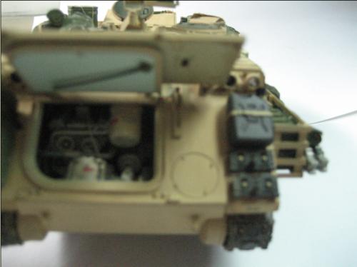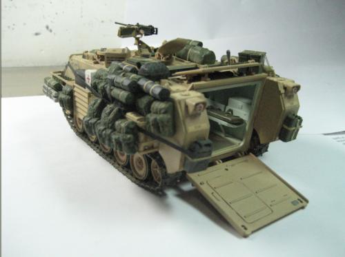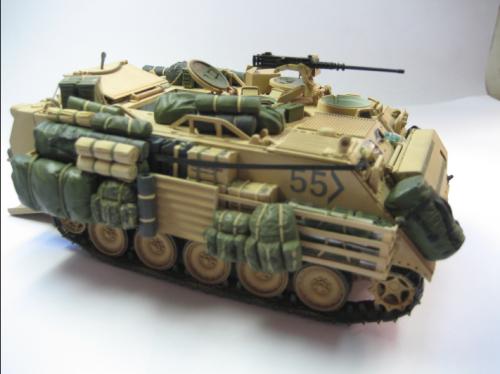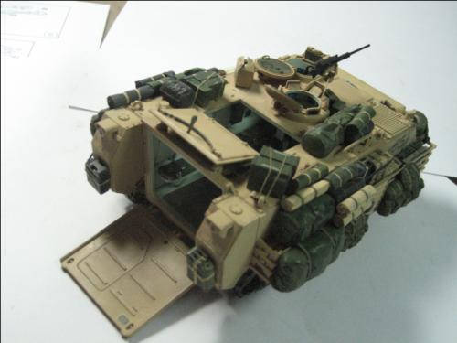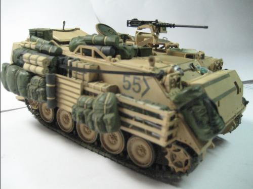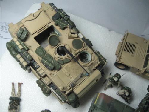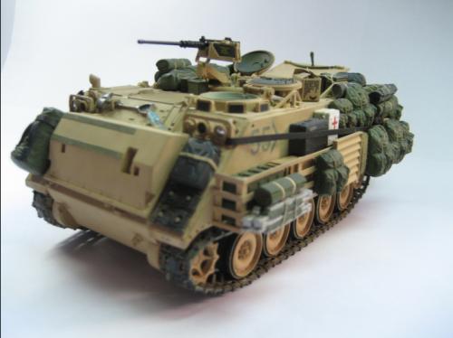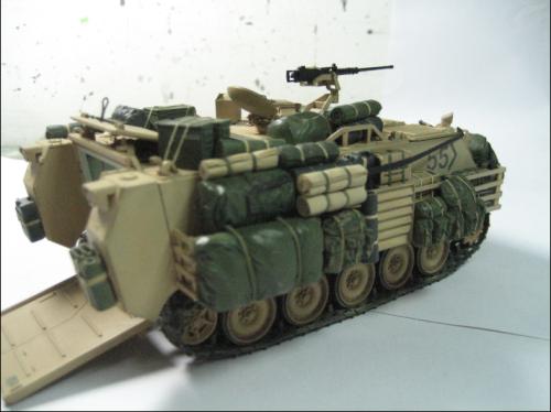 使用爱德美的板件加田宫的美军现代装备,田宫水性漆上色XF-59加白色喷涂,自制坐垫,安全带和伫物筐,追加焊接纹,用天弓的M2机枪换了原来的机枪 爱的这个套件组合度上乘,但前装甲不能模拟实车的装卸,履带取用爱的M113 FITTER 的拼接履带,总共耗时30多小时。 本人第一次参赛,重在参与,希望各位前辈不吝赐教。