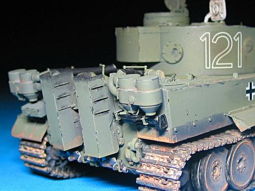 非洲军虎I与初期型虎I的相似最大。CYBER-HOBBY的非洲军虎I说明书已经将细节说明得很详细。所以要威龙的虎改起来并不太麻烦,因为说明书很多都是相似的。非洲军虎I和初期型最大的区别在于排气管的护罩和炮塔的后部储物箱。护罩在沃雅和ABER的蚀刻片里已经有提供,后部储物箱本来打算使用沃雅提供的专门非洲型蚀刻片,但是在询问了沃雅销售人员以后,得知还没有上市。所以只好选择自己制作,关于制作的具体步骤,可以参考我之前发的树脂翻模的帖子。这个储物箱比晚期型的储物箱要扁一些,是最明显的特点。 材料装备好之后就是制作的问题。制作上没有什么值得特别指出的。涂装方面,选择了比较特别的绿色涂装。实际上严格来说,从CYBER-HOBBY的说明上都可以看出实际颜色是一种类似潜灰色的颜色。在阳光的长时间照射下,会显得有些发绿。但是为了美观决定还是加一些绿色成分里面。我这次使用的颜料是MODEL MASTER的水性涂料。使用后效果非常好,可以说是我用过的最好的涂料了,当然价格也很贵,一瓶颜料的价格相当于2个田宫水性的价格。 旧化方面,使用的是我一贯使用的方法——天然土。没用油画颜料泽洗,因为是单色的缘故。掉漆在边缘处处理,然后是弹孔,履带方面要仔细处理。模型的旧化因人的喜好而定,我个人是喜欢唯美的风格,就是干净些。 制作完之后,感觉挺累,但是对于模型制作的经验上是得到了不少收获。如果想改龙的非洲军虎I,可以用威龙的初期虎和晚期虎一起,会省很多事。