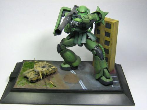 扎古II的细节处理很好,旧化比较得当,战车的细节补充仍需加强,地面以及房屋对于这个尺寸来说显得有些单调, |